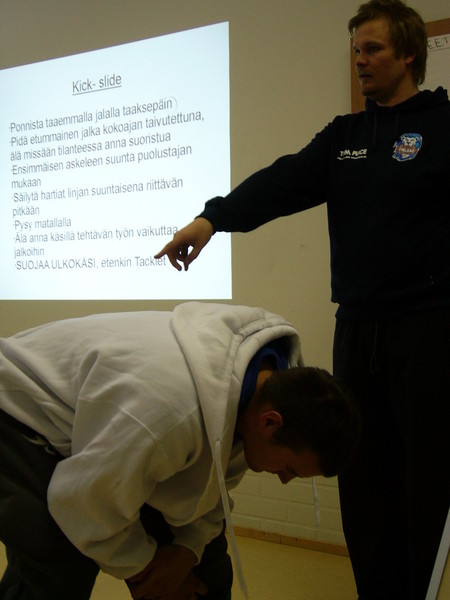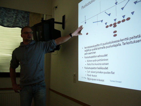 SAJL 2-tason lajitutkinnon kurssitarjonta laajeni, kun Pajulahden Urheilukeskuksessa järjestettiin kaksi pelipaikkakurssia. Kursseille osallistui nelisenkymmentä valmentajaa ja urheilijaa, joille ammennettiin päivitettyä tietoa, tekniikkaa ja harjoiteita pelipaikkavalmentajan tietolaarista. Seuraava 2-tason kurssi on Pajulahdessa 16.3., jolloin tukimiehet&keskushyökkääjät ovat käsittelyssä. ll-tason kurssi laitahyökkääjille ja takamiehille käynnistyi Tuomas Kivisaaren ja Klaus Alisen luennolla, jota täydennettiin käytännön harjoitteilla. Kivisaari esityksessään painotti kokonaisuuden ymmärtämistä laitahyökkääjän pelaamisessa. Alinen toi kokemuksellaan Atlanta Falconsista ja NFL Europesta tight endin näkökulmaa. Koulutussessio piti sisällään yleistä pelipaikasta, laitahyökkääjän perusominaisuudet, pelin jakaminen; esimerkki Corner –kuvion jaottelusta, laitahyökkääjän heittopuu, kuvioiden juokseminen, pallon kiinniottaminen, stanssi, puolustuksen tunnistaminen, puolustusten ominaisuuksia WR:n näkökulmasta; releaset, breakit, yksittäisistä kuvioista heittohyökkäyksen ymmärtämiseen teeman purkamista, esimerkkejä eri heittoyhdistelmien pelaamisesta, erilaiset movet, pelaaminen pump and run –puolustusta vastaan sekä blokkaaminen. Lopuksi Kivisaari toivotti kaikki kurssilaiset tervetulleiksi laitahyökkääjien omille nettisivuille. Takamiesluennolla maajoukkueen puolustuskoordinaattori Kari Titola aloitti Nikula-hallissa pilottiurheilijoiden harjoittamisen, jossa hän kävi läpi pelipaikkavalmentajan näkökulmasta eiri harjoitteita. Luokkahuoneessa oppimista täydennettiin Titolan luennolla, jossa teemoina olivat mm. yleistä pelipaikasta, takamiesten fyysiset ja psyykkiset perusominaisuuksia, takapuolustajan pelin jakaminen, yleiset mies- ja aluepeitot, sijoittuminen, hyökkäysmuodostelman tunnistaminen, puolustamisen perusprinsiipit heittopuolustamisessa, lukuavaimet, puolustuksen piilottaminen, liikkeelle lähtö-peruutus-reititys-pump&run, pelin lukeminen heitto vs juoksu – heittokuvio kombinaatiot, reititys ja blokinpoisto, breikkaus palloon, taklaus-maahanlyönti-syötönkatko. Hyökkäyslinjaluennolla oli tuoretta ja päivitettyä tietoa, kun maajoukuevalmentaja Ville Tarvainen esitteli New York Jetsin miehistöstä palanneen Iiro Luodon kanssa linjamiehen fundamentaaleja. Millainen on hyökkäyslinjamies kysyi kurssilaisilta Tarvainen aluksi, josta päästiin hyökkäyslinjavastuiden kautta maalitauluajatteluun blokkaamisessa. Lähtöasento, drive blokki askeleittain, reach -, trap blokki, pull out, cut-blokki, zone blokki. Heittoalue, heittotyypit ja blokit, alkuasento heittoblokissa, linjapuolustajan sijainti heittoblokissa, heittosuojaustekniikat, heittoblokin epäonnistumisen syyt. Tukimiehen blokkausta, heittoblokin askeltamista ja perustekniikoita kouluttajat drillasivat palloilusalissa. Samalla kerrattiin yhteistoimintablokit eli lyhyesti yt-blokeiksi ristityt tuplablokki, combo ja cross ja fold blokit. Muutamia stuntteja vastaan harjoiteltiin myös blokkaustapoja. Puolustuslinjaan kurssilaiset perehdytti kaksi kokenutta alan asiantuntijaa Tuomas Heikkinen ja Arttu Suokas.Tekniikkaosuudella linjapuolustajille sopivien ketteryysharjoitusten jälkeen, Heikkinen ja Suokas purkivat lähtöasennon kautta, charge tekniikan eri vaiheet valmentajien ja pilottiurheilijoiden. Sen jälkeen ohjelmassa käytiin tekniikoita eri blokkeja vastaan sekä perusheittoryntäystekniikoista rip, swim, bull rush, push pull ja niiden kombinaatioita. Lopuksi kokonaisuutta selvennettiin kertaamalla linjapuolustajien rush lanet ja liikkuminen muutamia esimerkkipelejä vastaan. Teoriatunneilla syvennettiin tekniikoita ja lisättiin esimerkein 4-3-puolustamisen näkökulmista linjapelaamista ja vastuita. Heikkinen esitteli sopivia harjoitteita pienille miehityksille suomalaisiin harjoitusolosuhteisiin, joilla päästään drillaamaan oikeita asioita pienillä resursseilla. Kuinka usein linjapuolustaja on ollut vaikkapa metrin päässä pelinrakentajasta heiton lähtiessä ottelussa. Kun tämän asiaa tutkitaan tarkemmin, metrin matka pelinrakentajan säkitykseen 5-6 krt ottelussa voidaan jäljittää huonon lähtöasentoon, ensimmäisiin askeliin, ajoituksiin, tekniikoihin. Fysioterapeutin näkökulmasta Suokas esitti, kuinka tärkeää pelaajan liikkuvuus ominaisuudet ovat lähtöasennosta lähtien. Tuomas Heikkinen painotti valmentajille suomalaisen amerikkalaisen jalkapallon oppimiskäsityksen eroja vs. USA:ssa tapahtuvaa lajiharjoitteluun. Kurssin lopuksi Heikkinen peräänkuulutti pelipaikan fyysisyyttä ja toivoisikin, että lisää panoksia laitetaan suomalaiseen linjamiespelaamiseen. |