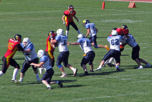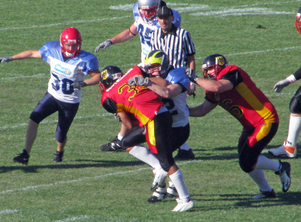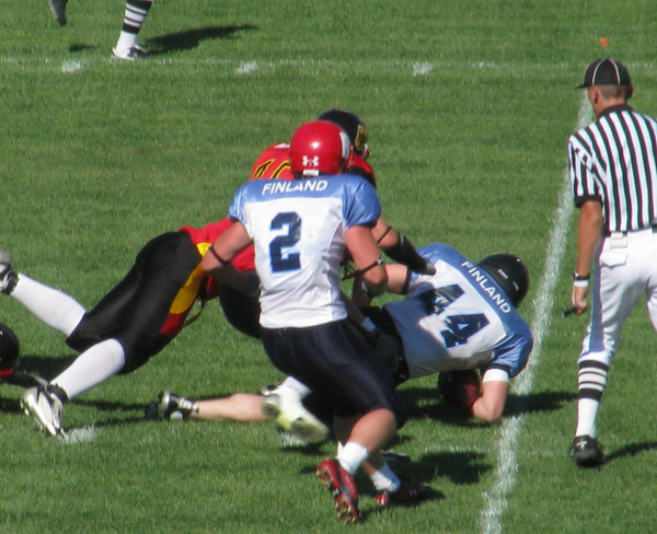 Saksan nuorten joukkue oli Suomen joukkuetta vahvempi numeroin 34-7. Lue otteluraportti. Suomen pisteistä ottelussa vastasi Ville Lindsten (6p) ja Julius Majander (1p). Suomi kohtaa seuraavassa ottelussaan Itävallan tiistaina 15.7. aamupäivällä.Alkulohko B:n matsi viimein kahden harjoituspäivän jälkeenssa lähti hyvin käyntiin suhteutettuna siihen, että yhtään harjoitusottelua ei ollut pelattu. Janne Lehtisen pitkä juoksu avasi jaardisaldon.Suomi sekavan alun jälkeen tuli mukaan hyvin peliin. Paras peli Lehtisen oma juoksu. Kaarlehto toisessa drivessa auki. Majander otti uloskuvan kiinni. Pelätyn ison puolustuksen kanssa Suomi-pojat pärjäsivät todella hyvin. Suomen liikkuva hyökkäyslinja taisteli mainiosti. Janne Lehtisen hyvä liikkuminen pohjusti juoksuja ja myös muutaman mainion heiton. Suomi kolmas draivi lähti kovalla sykkeellä eteenpäin. Tilannetta alusti Anssi Saaren upea syötönkatko flatillä. 12 jaardin linjalla Antto Kaartisen kiinniotto toi Suomen 12 jaardin päähän Saksasta. Suomen isoin sinkkubacki Ville Lindsten toi palloa kahden kannon verran 8 jaardia. Janne Lehtinen syöksyi ensimmäisiin yrityksiin. 2 jaardin pusku fb Ville Lindsteniltä toi tasoitusmaalin. Julius Majander potkaisi lisäpisteen 7-7 ajassa 8:46 toisella neljänneksellä. Puolustus teki hartiahommin töitä, mutta kuuma Sevillan San Pablo kenttä ja saksalaisten voimakas juoksupeli pohjusti Saksan toisen maalin. .Lisäpiste ohi 13-7 ja tilanne. Suomi jatkoi ennakkoluulottomalla heittopelillä ja Julius Majanderillä sisäkuviolla edettiin aimo annos jaardeja. Hienoja kauhun hetkiä koettiin, kun muutaman pelin päästä Lehtinen heitti täysin vapaalle Pehu-Lehtiselle, mutta heitto meni vähän yli. Sitten seurasi murheellinen hetki, jossa sisältöinä olivat säkitys, väärä aloitus ja pelin viivytys. Saksa joutui puolustamaan entistä agresiivisemmin ja alkoi tuomaan dusseldorfilaista heat`tiä. Suomen puolustuksessa tukimies Välimaa veti lepakkoiskun palloon Saksan aloittaessa massiivisen vyörytyksen ensimmäisen pelipuoliskon lopuksi. Saksa ei kuitenkaan onnistunut lopuissa yrityksissään ja pelinrakentajan juoksuyrityksen pysäytti Suomen hyvä ja tiivis juoksupuolustus. Suomi sai pallon vielä 1:14 pelikellossa. Suomi juoksi Matti Airaksisen kannoilla muutamat downit ja käytti ajan pois. Toinen pelijakso lähti Saksan hyökkäyksellä liikkeellä ja se johti myös ensimmäiseen lentopotkuun. Kovia taklauksia suorittivat tukimiehet Välimaa ja Westerlund. Suomen harmiksi vaihtovirhe Saksan 4:llä yrityksellä antoi heille mahdollisuuden jatkaa hyökkäystään. Saksalaispelinrakentajista voi sanoa, että he pitivät suomalaiset hyvin pelissä mukana, sillä heidän heittonsa menivät poikkeuksetta espanjalaisille harakoille ja mustarastaille. Vahvajalkainen puoliamerikkalainen Randalla Pane juoksi toisen maalinsa, kun isokokoinen linja teki raivoisasti tilaan. 2 pisteen peli onnistui myös. Tilanne 21-7. Suomen 3. neljänneksen ensimmäinen hyökkäys lähti hyvistä asemista. Julius Majanderin palautus saapuin 45 jaardin päähän saksalaismaalista ja siihen lisättiin saksalaisrangaistus päälle. Juha ”Kentaro” Kärnä juoksi ketterän 8 jaardisen, mutta sen jälkeen hyökkäys tyrehtyi hand off virheeseen ja yhteen Lehtisen pakoyritykseen. Suomen hyökkäyslinja taisteli hienosti. Saksa jatkoi valitsemallaan linjalla juosten keskilinjaa pitkin. Saksa onnistuikin neljännen jakson päätteeksi viemään tummapintaisen pikakiitäjänsä Malekin voimin Saksan turvallisen tuntuiseen johtoon 28-7. Suomi taisteli mutta alkoi selvästi väsyä. Antto Kaartisen ja Miro Kadmiryn rauhallisen varmat kopit säestettynä Ville Lindstenin kannoilla vei Suomalaiset 30 jaardin linjalle. Saksalaiset aloittivat jälleen kerran Lehtis-jahdin ja rauhallista heittotilaa saati aikaa ei saatu. Viimeiset hetket Suomi pelautti laajaa pelaajakaartia ja kaikki saivat maistaa pelaamisen hurmaa +43 celsiusta San Pablon elohopeamittarissa numeroihin 35-7. Saksalaiset jaksoivat blitzata aivan ottelun loppun asti. Tilastopoimintoja: Lehtinen 7/20 heitot, yksi syötönkatko. Hänet säkitettiin kolmesti. Kiinniottajista Miro Kadmiry otti 3/38, Kaartinen 2/39 ja Majander 2/38. Paras pallonkantaja oli Ville Lindsten 34 jaardia yhdeksällä kannolla. Keskiarvojuoksussa Janne Siltanen kävi vetäisemässä yhden yhdentoista jaardin siivun. Max Westerlund otti miehekkäät 4+2 taklausta. Hänen vertainen taklauskumppani oli Martti Välimaa, joka joka kokosi 2+3 taklausta sekä yhden säkityksen. Linjamiehistä Riku Kuusisto oli kovalla taistelutuulella ja väänsi 1+3. Takamiehistä kuumeesta toipunut Miikka Lievonen otti 2+2 taklausta. Anssi Saari taklasi 1+2 ja otti syötönkatkon, josta Suomi teki ainokaisen maalinsa. Saksalaisista aivan ehdoton oli Randall Pane joka juoksi kymmenen jaardin keskiarvolla 8 kannolla 85 jaardia. Malek Said säesti hänt juoksemalla kymmenellä kannolla 82 jaardia. Pelinrakentaja Demersin luvut olivat 4 onnistunutta heittoa kymmenestä. 1 säkki.