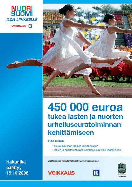 On jälleen aika erilaisten nuorisoprojektien tukirahojen hakemiseen Nuorelta Suomelta. Netin kautta tehtävillä hakemuksilla Nuori Suomi ry:lle kehittämistukea voi hakea eri hankemuotoihin. Hakuaika päättyy 15.10.2008 Lisätietoa: http://www.nuorisuomi.fi/hankemuotojen_kriteerit Hakulomakkeet: http://www.nuorisuomi.fi/hakulomakkeet08 Vuonna 2008 kehittämistukea myönnetään sellaisille hankkeille, jotka lisäävät laatua seuratoiminnassa tai tarjoavat lisää harrastamisen mahdollisuuksia lapsille ja nuorille. Seuratoiminnan kehittämistuki on jaettu viiteen eri hankemuotoon. Laatua seuratoimintaan: 1. Sinettiseurahanke 2. Lasten ja nuorten ohjaajien ja valmentajien osaamishanke Sinettiseuroille 3. Löydä liikunta -kerhon perustaminen (6-12v.) 4. Lajikohtaisten harjoitusryhmien lisääminen (6-12v.) 5. Nuorten harrastustoiminnan käynnistäminen tai laajentaminen (13-19v.) Seuratoiminnan kehittämistukea voivat hakea hankkeet, jotka kehittävät urheiluseuratoiminnan laatua ja lisäävät lasten ja nuorten harrastusmahdollisuuksia. Tukiraha voi käyttää hankkeisiin, jotka toteutuvat 1.9.2008−31.12.2009. Tukea ei myönnetä seuralle tai seuran lajijaostolle, joka on saanut viime vuonna tukea samaan hankemuotoon. Kehittämistuen sähköinen hakulomake tulee lähettää viimeistään 15.10.2008. Mikäli sinulla ei ole mahdollisuutta täyttää sähköistä hakulomaketta, tilaa hakulomake Nuoresta Suomesta. Tuen saajat julkistetaan joulukuussa 2008 maakunnallisissa tilaisuuksissa. Kaikille hakijoille postitetaan tukipäätös henkilökohtaisesti. Tuen saajat kerrotaan maakunnallisissa tilaisuuksissa ja tilaisuuksien jälkeen tällä sivustolla. Tuen saajat allekirjoittavat sopimuksen valtionavustuksen käytöstä.