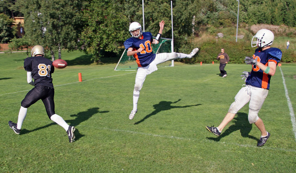 14-17-vuotiaiden SM-sarjassa on kaudella 2009 puhaltaneet uudet tuulet. C-nuorten loppuottelussa kohtaavat Oulu Northern Lights ja Sipoo Bulldogs. Pronssisista mitaleista kilpailevat puolestaan Kuopio Steelers ja Porvoo Butchers. Mitaliottelut pelataan la 12.9. Oulussa ja Kuopiossa. Välieräottelussa Porvoossa Suiston kentällä Butchers sai hyvällä latauksella otteluun tulleen Oulun Northern Lightsin vieraakseen. Vauhdikas ja hyvätasoinen ottelu marssittiin loppuun asti oululaisten johtamana lopputuloksen ollessa 14-45 (6-26). Oulun keskushyökkääjä Mika Nissinen teki mahtavat jaardimäärät ottelussa. Nissinen mursi läpi ottelun porvoolaistaklauksia ja karkasi maalintekoon. Eteenpäin palloa kuljetti myös fullback Joni Huttu. Kaksikolle hyvää tukea antoi vikkeläkinttuinen toisen polven futari Niklas Krogerus, jonka isä Olli pelasi aikoinaan maajoukkueessa ja Polin SM-miehistössä. Krogerus on juossut suunnanvaihtopeleillä ja kiinniottanut 13 maalia tällä kaudella. Pelinrakentaja Heikkilä piti heittokättään säästöliekillä ja löysi tarvittaessa laitahyökkääjä Sormusen. Oulun vahvuuksiin kuului myös tasaisen varmasti toiminut puolustus, joka napsi ainakin kolme syötönkatkoa sekä piti vaarallisen pelinrakentaja Seppäsen jaardikarkailut kurissa. Näyttäviä kovaotteisia taklauksia nähtiin mm. Esmael Keisulta ja Sampsa Isohätälältä. Linjapeliä johti Oululta Jani Aarrekivi.Butchersin C-nuoret olivat selvittäneet alkusarjan murskaavasti tehden 186 pistettä ja päästämällä tasan 0 pistettä. Porvoolla olikin läpi ottelun vaikeuksia päästä rytmiin. Toisella jaksolla Porvoon puolustus pysäytti aivan maalinsa lähellä purjehtineet oululaiset kahdessa drivessa. Pelinrakentaja Seppänen joutui heittämään kiireessä, mutta onnistui löytämään muutaman makean pitkän heiton loppukohteeksi Phung Ngyenin. Porvoo peliä heikensi selvästi kovan kolmikon Micky Kyei, Toni Nyström ja Niko Roiko puuttuminen. Kaverit hakevat kansainvälistä vauhtia USA:n high school futiksesta parhaillaan. Toisessa välierässä Kuopion Väinölänniemen kentällä nähtiin tasaista peliä aina ottelun puoliväliin saakka Kuopio Steelersin ja Sipoo Bulldogsin välillä. 14-41 (14-14). Sipoo teki toisella hyökkäysvuorollaan Henri Jussilan kiertopelin päätteeksi 0-6 johtonumerot. Steelersin teräsverkkopuolustus blokkasi lisäpistepotkun. Kuopio tasoitti pelinrakentaja Topi Survon juoksulla numeroiksi 6-6-. Toinen neljännes oli tasaista vääntöä, jossa Steelersin onnistui pitämään pelätyn keskushyökkääjäkaksikon Henri Jussila ja Ville Roitto aisoissa. Kuopio sai myös kaksi syötönkatkoa Sipoon nuoren 15-vuotiaan varapelinrakentaja Julius Kujalan pelatessa paineen alla. Antti-Ville Kainulainen teki johtomaalin savolaisille Survon syötöstä ja potkaisi kaksi pistettä lisää johtotilanteeksi 14-6. Vierailija Bulldogs onnistui hyvin onnistuneen kiertopelin päätteeksi tasoittamaan Henri Jussilan toimesta puoliajaksi 14 -14 lisäpistepotkun onnistuessa myös. Toisella jaksolla Steelersin miehistö joutui improvisoimaan, kun muutama avainpelaaja loukkaantui. Kuopiolaiset sinnittelivät vielä kolmannen neljänneksen ja Bulldogs johti yhdellä maalilla 14-22. Ottelun viimeisen jakson aikana tutkapari Henri Jussila ja Ville Roitto tekivät vuorotahtia juoksumaaleja Jesse Kolehmaisen ja Toni Pulkkisen raataessa linjassa. C-nuorten 1-divisioonan voitti Seinäjoki Crocodiles finaalissa Jyväskylä Jaguaareja vastaan 38-28 (16-28). |