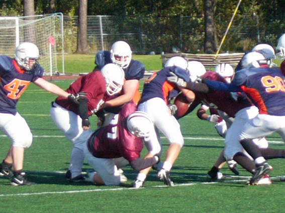 Sipoo Bulldogs voitti C-nuorten SM-kultaa. Hopea meni Ouluun ja pronssi Kuopioon. SM-finaali alkoi aurinkoisella Castrenin stadionilla Maamme-laululla. Northern Lightsin ja Sipoo Bulldogsin välillä ensimmäisen neljännes oli tasaista vääntöä. Molemmat joukkueet olivat opiskelleet toistensa hyökkäyspelaamista siinä määrin, ettei juoksupainotteisissa yrityksissä läpimurtoja nähty. Oulun keskushyökkääjä Mika Nissinen on kantanut muurinmurtajan lailla palloa läpi kauden, mutta ei onnistunut pitkiin läpijuoksuihin. Bulldogsin puolustuslinjassa Toni Pulkkinen onnistui tekemään useita taklauksia linjan takana. Bulldogsin kolmikko Nuutti Tanner, Ville Roitto ja Henri Jussila vuorottelivat juoksuvuoroissa, mutta eivät saaneet mainittavaa etenemistä aikaan. Toisella neljänneksellä molemmat joukkueet avasivat hyökkäyspalettiaan. Oulun Lassi Heikkilä heitti muutamat onnistuneet kaaret laitahyökkääjilleen. Bulldogsin puolustus piti rivinsä kurissa ja läpi ottelun tukimiehenä onnistunut Ville Roitto onnistui järkyttämään oikea-aikaisilla blitzeillään Oulun hyökkäysrakentelua. Pelinrakentaja Heikkilä toi Oulun Revontulet 15 jaardin pelinrakentajan juoksulla maalintekoalueelle, mutta Bulldogs onnistui kaappaamaan pallon itselleen seuraavalla yrityksellä. Bulldogs intoutui myös heittämään Joni Ranta-ahon voimin ja Marko Yliolli-Tervo otti muutaman varman kopin. Oululaisten taklauspeli oli kuitenkin varmaa ja pisteitä ei nähty Castrenin sähköisellä tulostaululla. Kun kaksi minuuttia oli jäljellä jaksoa Bulldogs sai toisen kerran irtopallon itselleen Ville Roiton alkutyön jälkeen. Bulldogs hyökkäsi jälleen kerran mutta lujapihtiset tukimiehet Oulusta eivät antaneet Henri Jussilalle tilaa. Joni Ranta-aho otti vielä Oulun hyökkäykseltä syötönkatkon neljänneksen loppusekunneilla. Kolmannen neljänneksen alkuvaiheissa Toni Pulkkinen väänsi jalkaansa ja Oulu sai hetkellisen otteen. Mika Nissinen ei kuitenkaan päässyt normaalivauhtiin, kun Bulldogsin puolustusmiehistö aiheutti kolmannen pallonmenetyksen Ville Roiton toimesta. Bulldogs marssi 30 jaardin päähän maalista, mutta tasaisessa väännössä ei onnistunut pisteiden teossa. Ottelun puolustajahahmo Pulkkinen palasi kehiin ja aiheutti jatkuvasti päänvaivaan oululaisten hyökkäyslinjalle nopeilla ensiaskelillaan ja hyvin suunnatuilla juoksukulmillaan. Oulun hyökkäys pudotti pallon kahdeksan kertaa ja peitti sen itse neljästi. Tilanne Castrenilla kutkuttava 0-0. Neljännen jakson aluksi Bulldogs pääsi Ville Roiton lentopotkun palautuksella 28 jaardin päähän maalista. Niklas Krogerus taklasi Henri Jussilan etenemisen jaardiin. Bulldog-heitto ei onnistunut ja reverse-peli imaisi oulun puolustajat takaa-ajoon ensimmäiseen hämäysuuntaan, mutta pallonvaihdossa ei onnistuttu. Viimeinen yritys ei tuottanut etenemistä. Oulu lähti hyökkäämään ja hyökkäyskoordinaattori Risto Kivelän takataskusta kaivettiin mm. vanha kikkapeli Vapaudenpatsas, jolla Niklas Krogerus ei päässyt vapaille pisteiden tekomarkkinoille kuten useasti aiemmin kauden aikana. Lentopotkun jälkeen Bulldogs malttoi jauhaa juoksupeliään linjan läpi ja ottelun ensimmäinen pistesuoritus nähtiin Henri Jussilan 60 jaardin juoksun jälkeen. Ottelun neljättä jaksoa oli jäljellä 5:27. Oulu vastasi hyvin kannustaneen kotiyleisön huutoon ja toi Mika Nissisen juoksuilla Northern Lightsit viidentoista jaardin päähän maalista. Oulu päätti yrittää 2. yritys ja 5 jaardia edettävää tilanteessa reverse-suunnanvaihtopeliä. Henri Jussila ei ollut kulmapuolustajana yllätettävissä ja hän taklasi Niklas Krogeruksen reiluisti miinus-jaardeille. Neljännellä yrityksellä takamies Teemu Christensen löi maalialueen kulmaan suuntautuneen heiton hallitusti maahan. Bulldogsin kuntopohja tuotti tulosta ja joukkue juoksi hieman väsyneen oululaispuolustuksen keskeltä kohtuullisa siivuja. Henri Jussila pinkaisi toisen maalin 52 jaardin pituisena ja vei Bulldogsin 0-12 johtoon. Ville Roitto kaunisteli numeroita hienolla puolustuspelillä jossa hän iski pallon pelinrakentaja Heikkilän kädestä ja kantoi tämän jälkeen pallon maaliin asti. Lisäpistepeli onnistui ja Bulldogs voitti historiallisen ensimmäisen Suomen mestaruutensa numeroin 0-19. Oulu Northern Lights kuittasi seurahistoriansa ensimmäsen mitalin nuorisosarjoissa. Bulldogsit jahtaavat toista mestaruutta ensi lauantaina klo 16.30 Vantaalla, jossa joukkue kohtaa B-nuorten finaalissa Jyväskylä Jaguaarit. Oulun d-junioreilla on puolestaan edessä pronssiottelu Turkua vastaan kotikentällään Castrenissa. Team MVP Mika Nissinen, Oulu Northern Lights Team MVP Henri Jussila, Sipoo Bulldog Game MVP Toni Pulkkinen, Sipoo Bulldogs |