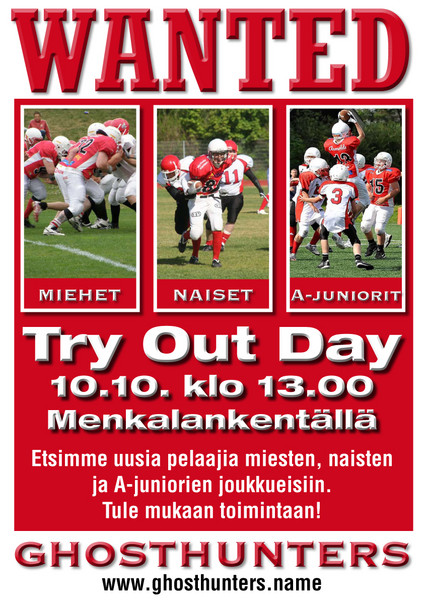 Nokia Ghosthunters värvää uusia pelaajia miesten, naisten ja nuorten joukkueisiin la 10.10. Menkalan kentällä klo 13.00.