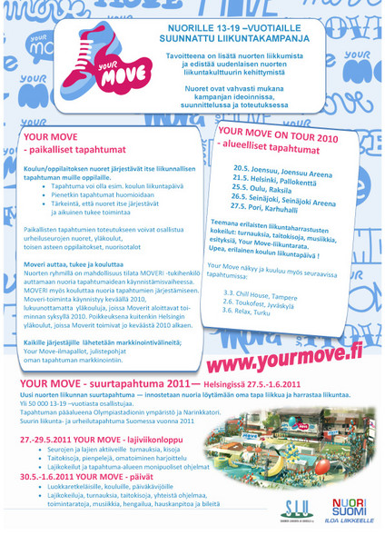 Nuorisotoimikunnan Esa Ikonen ja Erfan Jahangiri esittelivät liittokokouksessa tulevia your move -tapahtumia. Ole yhteydessä nuorisotoimikuntaan oman seurasi osallistumisesta toukokuun aluetapahtumissa. SLU ja Nuori Suomi taustayhteisöinä vastaavat your move -tapahtumista. Nuori Suomi vastaa operatiivisesta toiminnasta yhdessä lajiliittojen kanssa. Maaliskuun 31. päivä lyödään lukkoon SAJL jäsenseurojen osallisuus aluetapahtumissa, joissa on oman seuran ja lajin toimintaa voi esitellä muiden mukana. Ota yhteys välittömästi Esa Ikoseen tai Erfan Jahangiriin. Alueellisia YourMove-tapahtumia järjestetään keväällä 2010: Helsingissä 27.5.-1.6.2011 |