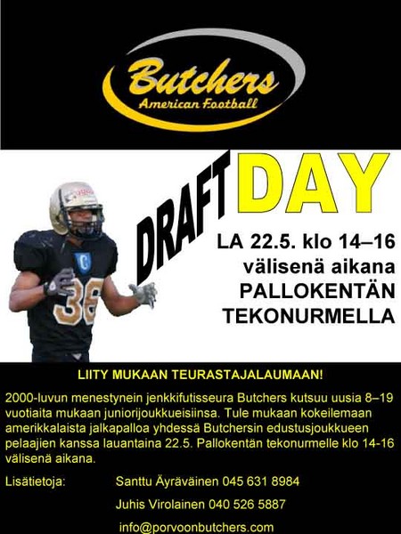 Uusille harrastajille järjestetään toukokuussa draft day-tapahtumia ympäri Suomea mm. Porvoossa 22.5. LIITY MUKAAN TEURASTAJALAUMAAN! 2000-luvun menestynein jenkkifutisseura Porvoo Butchers kutsuu uusia 8–19 -vuotiaita mukaan juniorijoukkueisiinsa. Tule mukaan kokeilemaan amerikkalaista jalkapalloa yhdessä Butchersin edustusjoukkueen pelaajien kanssa. Aika:lauantai 22.5. klo 14-16 Paikka: Pallokentän tekonurmi Lisätietoja: |