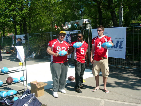 Amerikkalaisen jalkapallon osastolla keskitytään pallon heittoon ja blokkaamiseen. Helsinki Roosters ja Wolverines hoitavat pr-toimea mainiosti Helsingin Jäähallin parkkipaikalla auringon paistaessa. Kiertue jatkuu: