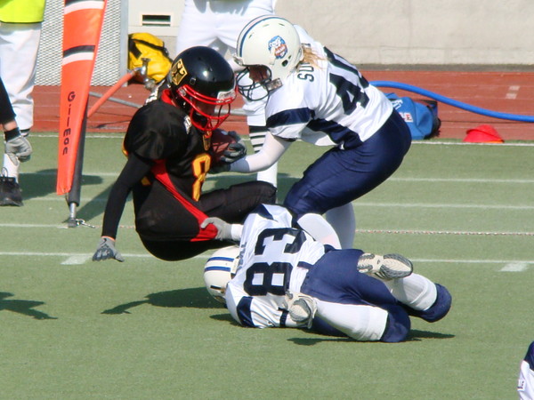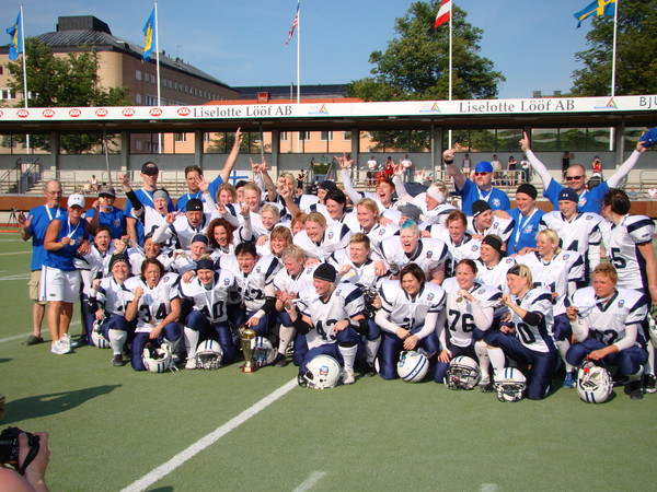 Saksa kaatui pronssiottelussa 26-18 (26-0) SUOMI VOITTI SAKSAN MM-PRONSSIOTTELUSSA TUKHOLMASSA Suomi voitti MM-pronssia historian ensimmäisissä amerikkalaisen jalkapallon naisten MM-lopputurnauksessa voittamalla Saksan lukemin 26-18 (26-0). Suomen keskushyökkääjä Merita Bruun (Helsinki Roosters) oli Suomen arvokkain pelaaja toista kertaa tässä turnauksessa, juosten 2 maalia ja dominoimalla peliä henkilökohtaisilla suorituksillaan. Suomi oli suvereeni ottelun ensimmäisellä puoliskolla tehden neljä maalia. Toisella puoliskolla päävalmentaja Teemu Kuusisto kertoi pienten virheiden suman antaneen Saksalle mahdollisuuden tulla otteluun mukaan. Suomen puolustus kesti kuitenkin viimeiseen pillin vihellykseen asti ja historiallinen arvomitali oli Suomen. Samalla Suomi sijoittui turnauksessa parhaiten eurooppalaisista joukkueista. Suomen naisten maajoukkue pelasi yhtenä joukkueena koko turnauksen ja pystyi esittämään maailman toiseksi parasta naisten heittopelaamista hyökkäyksessä USA:n jälkeen. Saksan valmentajat kehuivat suomalaisten urheilullisuutta ja vikkelyyttä. Vaikka suomalaiset eivät koossa ja voimassa vastanneetkaan vastustajia, pystyivät he hyödyntämään tämän edun. Huolimatta siitä, että Suomessa siirryttiin pelaamaan vastusteet päällä vasta kaksi vuotta sitten, on moni Suomen joukkueen pelaaja pelannut lähemmäs kymmenen vuotta. MM-loppuottelussa lauantaina klo 20.00 kohtaavat USA ja Kanada. Suomen MM-pronssijoukkue Pelinrakentajat Keskushyökkääjät Laitahyökkääjät Hyökkäyksen linja Puolustuksen linja Tukimiehet Takamiehet Teemu Kuusisto, päävalmentaja Muu valmennus Huolto |