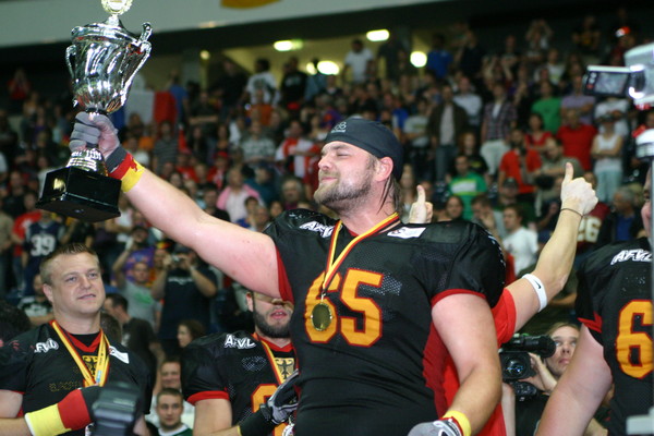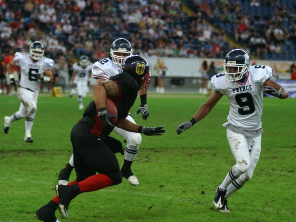 26-10 -voitto Ranskasta nosti Saksan toista kertaa mestariksi Saksa voitti Euroopan mestaruudenSaksa voitti historiansa toisen jenkkifutiksen Euroopan mestaruuden lauantaina. Finaalissa kaatui Ranska lukemin 26-10 (12-3). Aiempien otteluiden tapaan Saksan puolustus dominoi ottelua eleettömällä ja virheettömällä pelillään. Ranska eteni ottelussa vain 148 jaardia, ja ainoa touchdown syntyi rähmäyksen palautuksesta. Saksan pelinrakentaja Dennis Zimmermann heitti finaalissa 331 jaardia ja kolme touchdownia. Hänet valittiin koko turnauksen parhaaksi pelaajaksi. Loppuottelua seurasi Frankfurtin Commerzbank Arenalla noin 8 500 katsojaa. Hopeamitali oli Ranskan ensimmäinen EM-mitali. Pronssiottelussa Itävalta kukisti Ruotsin 30-0. |