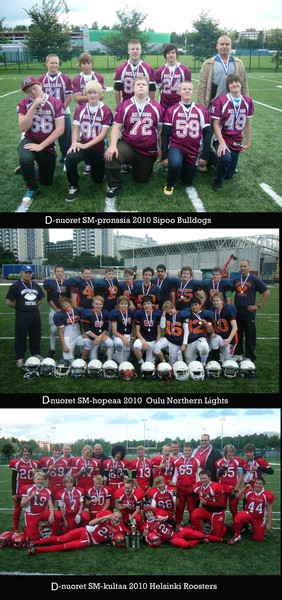 Helsinki Roosters voitti suvereenisti D-nuorten finaalin Oulu Northern Lightsia vastaan. Sipoo Bulldogsille pronssia. 9 vs. 9 miehistöin pelattu ottelu SM-loppuottelu oli yksisuuntaista menoa, sillä Roosters ehti takoa numerot 66-0 (38-0). Roostersin puolustus toimi kuin lukko ja oulun sisukkaat 13-15-vuotiaat hyökkäyspelaajat pääsivat vain kerran 25 jaardin sisään pisteidenteko mahdollisuuteen. Koko kauden aikana ainoastaan yksi maali saatiin aikaiseksi Bulldogsien toimesta. Helsinkiläiset ovat saaneet kovaa rutiinia otteisiinsa, kun lähes puolet joukkueesta on ollu pelaamassa myös C-nuorten SM-sarjassa. Valmentajat Sami Aalto, Jarkko Aaltonen ja Jarmo Lahti korostavat menestyksen tulleen nimenomaan joukkuepelaamisesta. Yksi tätä edistävä seikka on ollut yhteisharjoittelu naisten SM-joukkueen kanssa. Parhaimmillaan harjoituksissa on ollut kuusi valmentajaa ja nelisenkymmentä pelaajaa, jolloin pelipaikkakohtaisessa ja scrimmage-harjoittelussa on saatu lisää tehoja. Harjoittelu naispelaajien kanssa on kehittänyt Roosters d-junioreiden pelinopeutta. Lisäksi Roosters on pystynyt pitäämää vauhtia linjoissa kun sillä on erilliset miehistöt molemmille puolille palloa.