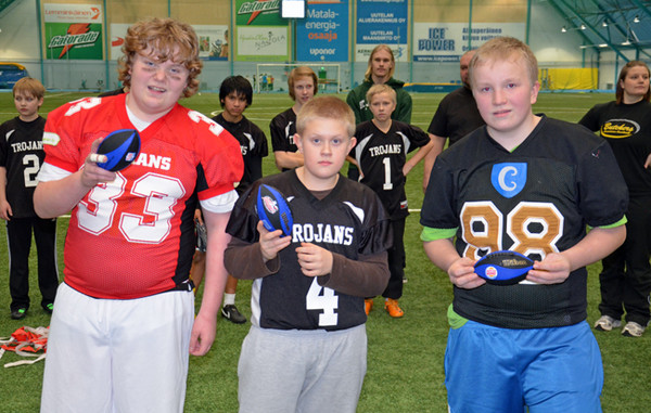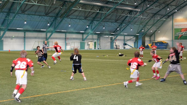 Pajulahden upouudessa sisähallissa pelattiin 10-13-vuotiaiden SM-kisat lippupallossa. Muutamien peruutusten jälkeen turnaukseen osallistui lopulta kolme joukkuetta. Perjantain iltapäivä sujui hyvässä liikkeessä Turku Trojansin, Kouvola Indiansin ja Porvoon Butchersin kamppallessa toistensa kanssa 10-13-vuotiaiden lippupalloherruudesta. Edellisen kerran kyseiselle ikäluokalle on jaettu mitaleita 1990-luvun puolivälissä.Ensimmäisessä ottelussa Indians ja Butchers pelasivat tasaista flagia. Puoliaikanumerot olivat 12-12. Butchersin valmentaja Pilvi Ryynänen hyödynsi blitzaavan puolustajan jättämää keskisaumaa ottelun loppuvaiheissa usean tärkeän kiinnioton verran. Butchers voitti ottelun niukasti 20-24. Carola Lindholmin valmentamat Indiansin tulivat määrätietoisesti viimeiseen otteluun. Kolmas kamppailu oli luonteeltaa edellisten kaltainen tasainen taisto. Puoliaikajohto 14-20 oli Indiansille. Eniten pisteitä tehneen puolustuksen turnauksessa omasi Trojans, jonka joukkuetta luotsasi Ville-Valtteri Suojanen. Ottelussa Kouvolaa vastaan turkulaiset tekivät maalin ja lisäpisteen syötönkatkoista. Kuitenkin hyvin yhteen pelanneet kouvolailaiset pitivät kutinsa ja voittivat lopulta ottelun 21-32. Ilman loukkaantumisia sujunut turnaus oli hyvätasoinen ja vastasi tarkoitustaan. Lippupallon 5 vs 5 peli kehittää erityisesti joukkueiden heittopeliä ja siinä opitaan jenkkifutikseen liittyviä olennaisia taitoja turvallisesti. Ensi vuodelle kaavaillaan samaan ajankohtaa lisää turnauksia ja laajemmalle osallistujamäärälle. 2012 U13 lippupallon SM-kisat: |