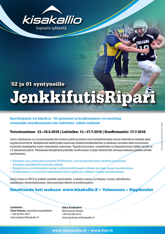 JenkkifudisRipari 2016Sporttiriparin voi käydä jo ´02 syntyneet ja konfirmaation voi suorittaa omassakin seurakunnassa niin halutessa. Lähde mukaan! Tutustuminen 13.–15.5.2016 Leiriaika: 11.-17.7.2016 Konfirmaatio: 17.7.2016 Leirin ohjelmassa on tutustumisjaksolla erilaisia peliharjoitteita että henkilökohtaisia taitoja kehittäviä treenejä sekä rippikoulutehtäviä. Kesäjaksolla keskitytään enemmän jenkkifudistekniikoihin ja pelataan nurmella sekä tutustutaan muihinkin kesälajeihin kuten esimerkiksi melontaan. Rippikoulutuntien, ryhmätöiden ja iltatapahtumien lisäksi leirillä on 1-2 lajitreeniä/päivä. Viimeisenä leiripäivänä pidetään konfirmaatio Lohjan lähettyvillä olevassa kirkossa (paikka selviää myöhemmin).