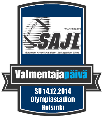 Tule mukaan SAJL:n valmentajapäivään sunnuntaina 14.12.2014 Olympiastadionilla Helsingissä. SAJL:N VALMENTAJAPÄIVÄ SUNNUNTAINA 14.12.2014 Paikka: Olympiastadionin monitoimitila, Helsinki. Sisäänkäynti Stadionin tornin juuresta vahtimestareiden opastuksella. Kohderyhmä: amerikkalaisen jalkapallon lajivalmentajat Hinta: SAJL:n valmentajalisenssin 2014 maksaneille ilmainen, muutoin 20 euroa (maksetaan käteisellä paikan päällä) Valmentajapäivä toimii samalla SAJL:n 2-tason SPEED-kurssin osasuorituksena (ei erillistä kurssimaksua) Ilmoittautuminen oheisella lomakkeella ke 10.12.2014 mennessä Aikataulu: klo 12.00-12.15 tervetuloa, esittelyt klo 12.15-13.15 Amerikkalaisen jalkapallon fyysiset ominaisuudet - kirjallisuuskatsaus - Esa Pietikäinen ja Esko Väisänen Kajaanin amk:hon tehty lopputyö aiheesta. klo 13.15-14.15 Perusteet lajinomaiseen liikkumiseen - Olli Jussila (Helsinki Roostersin fysiikkavalmentaja) Ilmoittautumiset Ilmoittautuneet: