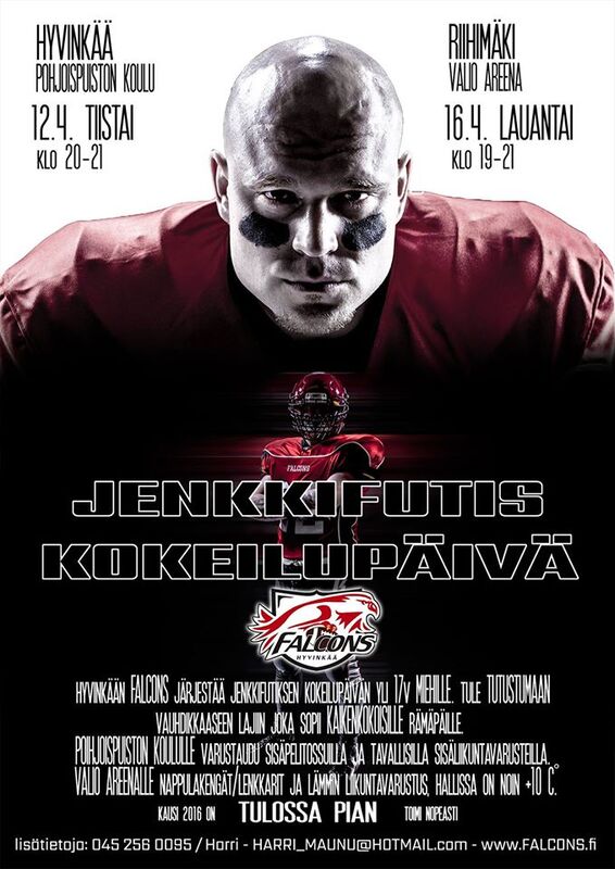 Kokeilupäivä Hyvinkäällä 12.4. ja Riihimäellä 16.4. Hyvinkää Falcons järjestää kaksi jenkkifutiksen kokeilupäivää huhtikuussa: 12.04. paikkana on Pohjoispuiston koulu Hyvinkäällä. Varustuksena sisäpelikengät ja sisäpelivarustus. 16.04. paikkana on Valio Areena Riihimäellä. Vastustuksena nappukengät tai lenkkarit ja lämmin liikuntavarustus (hallin sisälämpötila +10°C). Kokeilupäivä on tarkoitettu 17-vuotta täyttäneille miehille.