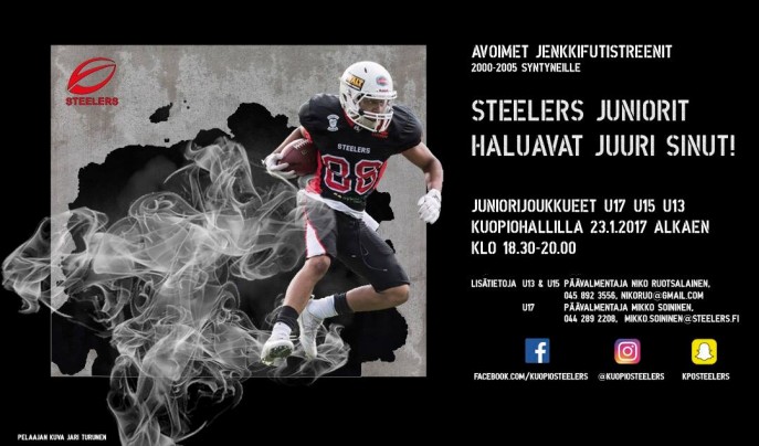 23. tammikuuta Kuopiohallilla mahdollisuus tutustua 13-, 15- ja 17-vuotiaiden joukkueen toimintaan Kuopio Steelers järjestää U13- , U15- ja U17-joukkueiden avoimet treenit Kuopio-hallilla 23.01 klo. 18.30-20.00. – Jos olet 2000-2005 syntynyt nuori, tule kokeilemaan, Steelersistä kerrotaan. – Aiempaa lajitaustaa ei tarvita ja mukaan tarvitset vain liikuntavarustuksen sekä juomapullon. Lisätietoja: |