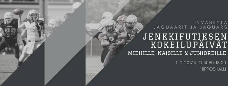 Hipposhallissa jenkkifutista 11. helmikuuta 14.30 – 18.00. Jyväskyläläiset seurat, naisten joukkue Jaguars sekä miesten joukkue Jaguaarit järjestävät yhteisen try out -päivän helmikuussa 11. helmikuuta. Tarjolla on kokeilumahdollisuus sekä naisille, miehille että 11–19 -vuotiaille junioreille. – Koolla tai liikuntataustallasi ei ole väliä, sillä tässä lajissa asenne ratkaisee! seurojen yhteisilmoituksessa kerrotaan. – Mukaan tarvitset liikuntavarusteet, nappikset / turffit / lenkkarit sekä juomapullon. Jos omistat hammassuojat, nappaa nekin mukaan (eivät ole kuitenkaan välttämättömät). Treenien jälkeen on mahdollista jäädä seuraamaan Jaguarsin naisien leiritreenejä. Aikataulu: 11–15 -vuotiaiden junioreiden try out klo 14.30 - 16.00