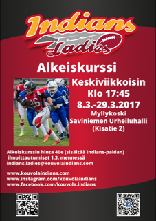 Ilmoittautuminen 1.3.2017 mennessä: indians.ladies@kouvolaindians.com Lisätietoja: Maija Laukkanen, puh. 044 3471053. |