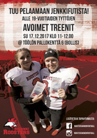 Helsinki Roostersin avoimet harjoitukset alle 19-vuotiaille sunnuntaina 17. joulukuuta. Helsinki Roosters on perustamassa tyttöjen amerikkalaisen jalkapallon juniorijoukkuetta! Avoimet treenit sunnuntaina 17.12.2017 kello 11–12.00 Töölön Pallokentän 6 tekonurmella (Bollis). Ilmoittautuminen ja varusteiden sovitus alkaa klo 10.30.