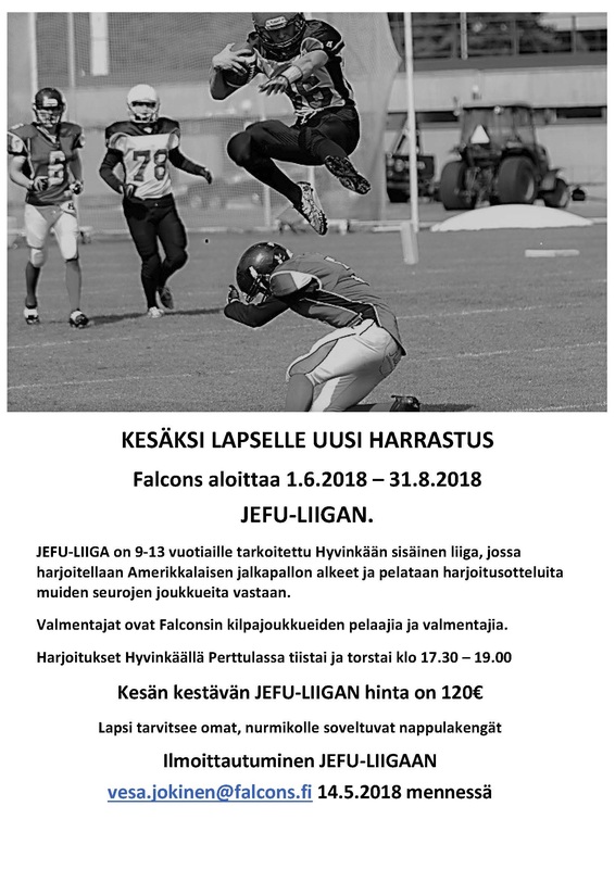 Ilmoittautuminen päättyy 14.5. ja kausi käynnistyy kesäkuun alussa. KESÄKSI LAPSELLE UUSI HARRASTUSFalcons aloittaa 1.6.2018 – 31.8.2018 Jefu-liigan Jefu-liiga on 9–13 -vuotiaille tarkoitettu Hyvinkään sisäinen liiga, jossa harjoitellaan amerikkalaisen jalkapallon alkeet ja pelataan harjoitusotteluita muiden seurojen joukkueita vastaan. Valmentajat ovat Falconsin kilpajoukkueiden pelaajia ja valmentajia. Harjoitukset Hyvinkäällä Perttulassa tiistai ja torstai klo 17.30 – 19.00 Kesän kestävän Jefu-liigan hinta on 120€ Lapsi tarvitsee omat, nurmikolle soveltuvat nappulakengät