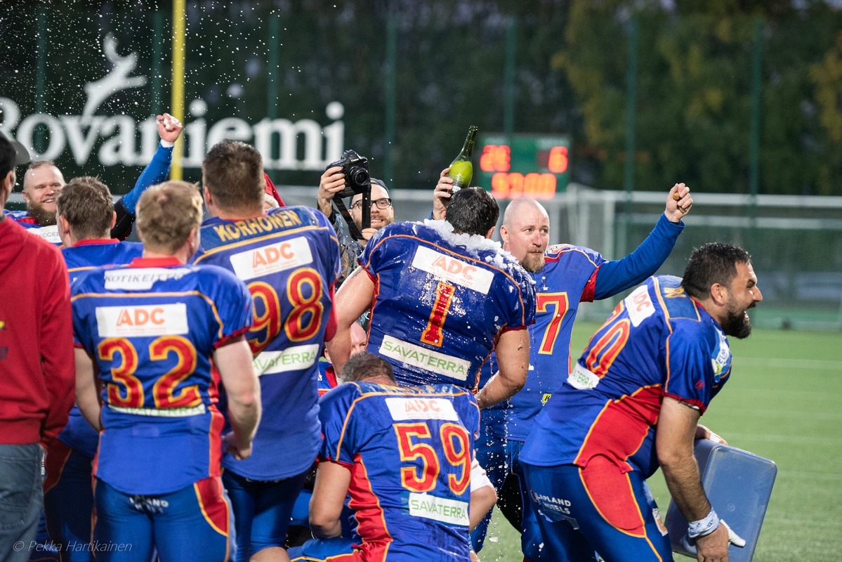 II-divisioonan mestaruus tuli Rovaniemi Nordmenille jo toisen tappiottoman kauden päätteeksi. Nordmen kukisti Rautamaljassa Porvoon Teurastajat 26-6 (21-6). Rovaniemen keskuskentällä 7.9. pelatussa ottelussa Neljän Tuulen Soturit saivat vastaansa myös tappiottoman kauden pelanneen porvoolaismiehistön. I neljänneksen ensimmäisellä hyökkäysvuorolla Teurastajat tekivät maalin heti ensimmäisellä yrityksellä. Pelinrakentaja Mikael Järvinen pitchasi pallon tuulennopealle Uche Nwosulle, joka kiitti kunniasta ja purjehti oikeaa laitaa pitkin maaliin. Lisäpistepeli epäonnistui. 0-6 johto Teurastajille. Nordmen ei kuitenkaan tästä häkeltynyt vaan eteni seuraavalla hyökkäysvuoroalla pallon kanssa varmasti kohti keskikenttää. Rafael Pineda heitti 37 jaardin maalin keskushyökkääjä Hannes Harjulle. Tomi Väänänen potkaisi lisäpisteellä Normenin johtoon 7-6. Lyhyeksi jääneen porvoolaisten lentopotkun jälkeen Nordmen pääsi hyökkäämään hyvästä kenttäasemasta 44 jaardin päästä. Rafael Pineda teki 13-6 numerot omalla kahden jaardin juoksullaan. Väänänen lisäsi pisteen potkaisemalla. Nordmen johti 14-6. Kahteen suuntaan pelannut pelaajavalmentaja Pineda on saanut rovaniemeläisen jenkkifutiksen kukoistuksen tilaan. Ahnaasti pelannut puolustus oli tehdä safetyn ensimmäisellä neljänneksellä, kun Juhana Pelkonen säkitti Mikael Järvisen aivan maalialueen tuntumassa. Toisella neljänneksellä Nordmen jatkoi tasaista tahtia. Kapellimestari Pineda teki toisen maalinsa jaardin päästä ja Väänänen potkaisi lisäpisteen. Puoliaikatilanne 21-6. Kolmannella neljänneksellä Nordmenin laitahyökkäjä Alfonso Ikäheimo teki komean heittopelin päätteeksi maalin. Väänäsen potku onnistui ja Rovaniemi johti turvallisesti 28-6. Teurastajille puolen kentän ylittäminen oli vaikeaa kurinalaisesti pelanneen Nordmen puolustuksen johdosta. Nuorista vaahteraliigapelaajista koottu Butchersin kasvattajajoukkue pelasi sisukkaasti, mutta tiukassa ottelussa se ei saanut hyökkäysrytmiä päälle. Teurastajat kokeili kikkapeliä kolmannella jaksolla flea flickerin muodossa, mutta Nordmenin Roni Laine katkaisi heiton tyylikkäästi ja lisäpisteitä ei enää tehty. Kolmenkymmenenyhden pelaajan rosterilla esiintynyt Nordmen pelasi kovaa pohjoisen futista. Kokemus ja muskelit olivat liikaa alle 20 pelaajan ryhmällä esiintyneelle porvoolaisyksikölle. Rovaniemi Nordmenin kahdeksastoista peräkkäinen voitto oli tosiasia. Finaali päättyi numeroihin 28-6. Nordmenin valmentaja Mikko Vähätalo: - Joukkue pelasi scouttitiedon mukaisesti ja olemme päässeet harjoittelemaan Rautamaljan luovutii 2-divisioonan mestarijoukkueelle itse joulupukki. Ensimmäisenä kiertopalkinnon kohotti viimeisen jenkkifutisottelunsa pelannut konkarilinjapelaaja Jari Haste, joka lopetta tähän kauteen uransa 57-vuotiaana. Team MVP rb/de Uche Nwosu, Porvoon Teurastajat