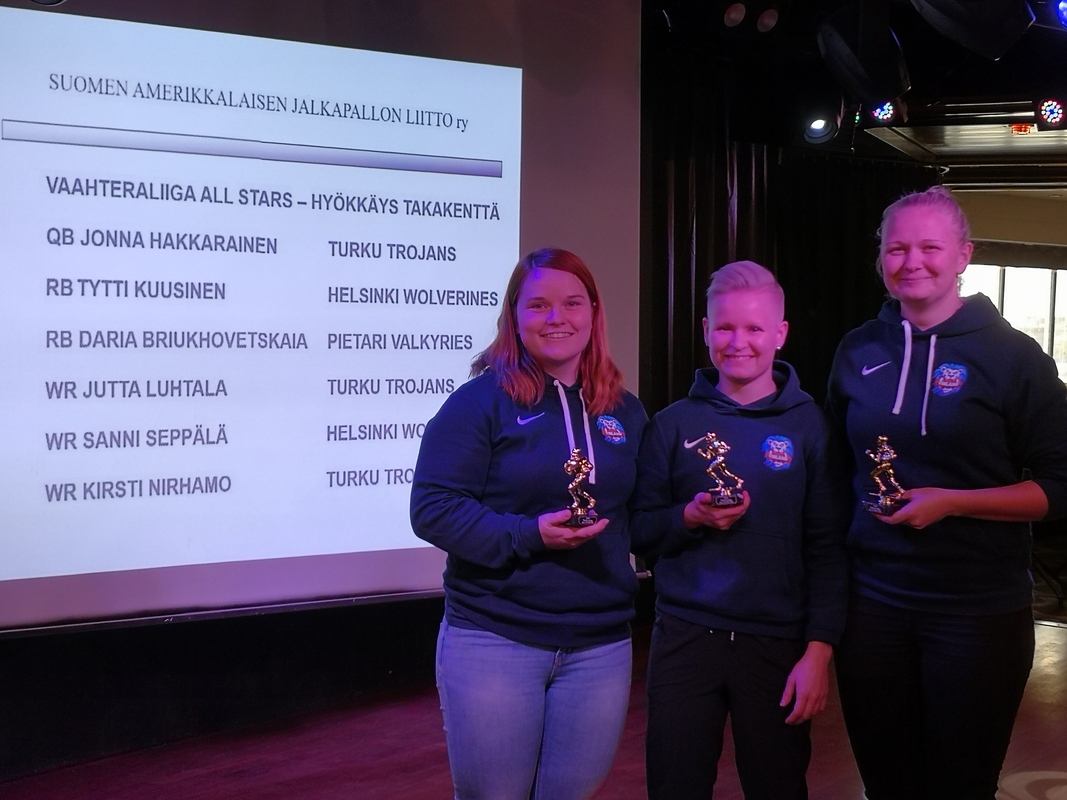 VAAHTERALIIGA ALL STARS – HYÖKKÄYS TAKAKENTTÄ QB JONNA HAKKARAINEN TURKU TROJANS RB TYTTI KUUSINEN HELSINKI WOLVERINES RB DARIA BRIUKHOVETSKAIA PIETARI VALKYRIES WR JUTTA LUHTALA TURKU TROJANS WR SANNI SEPPÄLÄ HELSINKI WOLVERINES WR KIRSTI NIRHAMO TURKU TROJANS