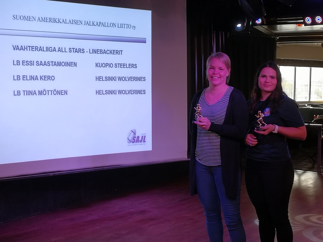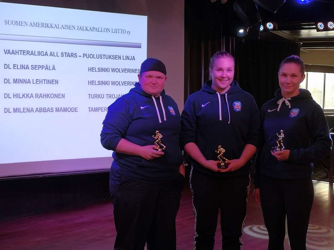 VAAHTERALIIGA ALL STARS - LINEBACKERIT LB ESSI SAASTAMOINEN KUOPIO STEELERS LB ELINA KERO HELSINKI WOLVERINES LB TIINA MÖTTÖNEN HELSINKI WOLVERINES