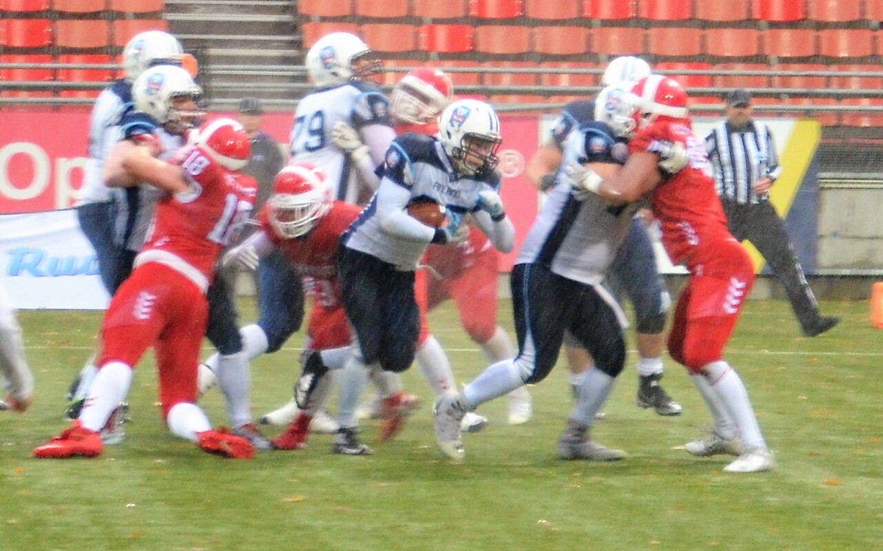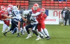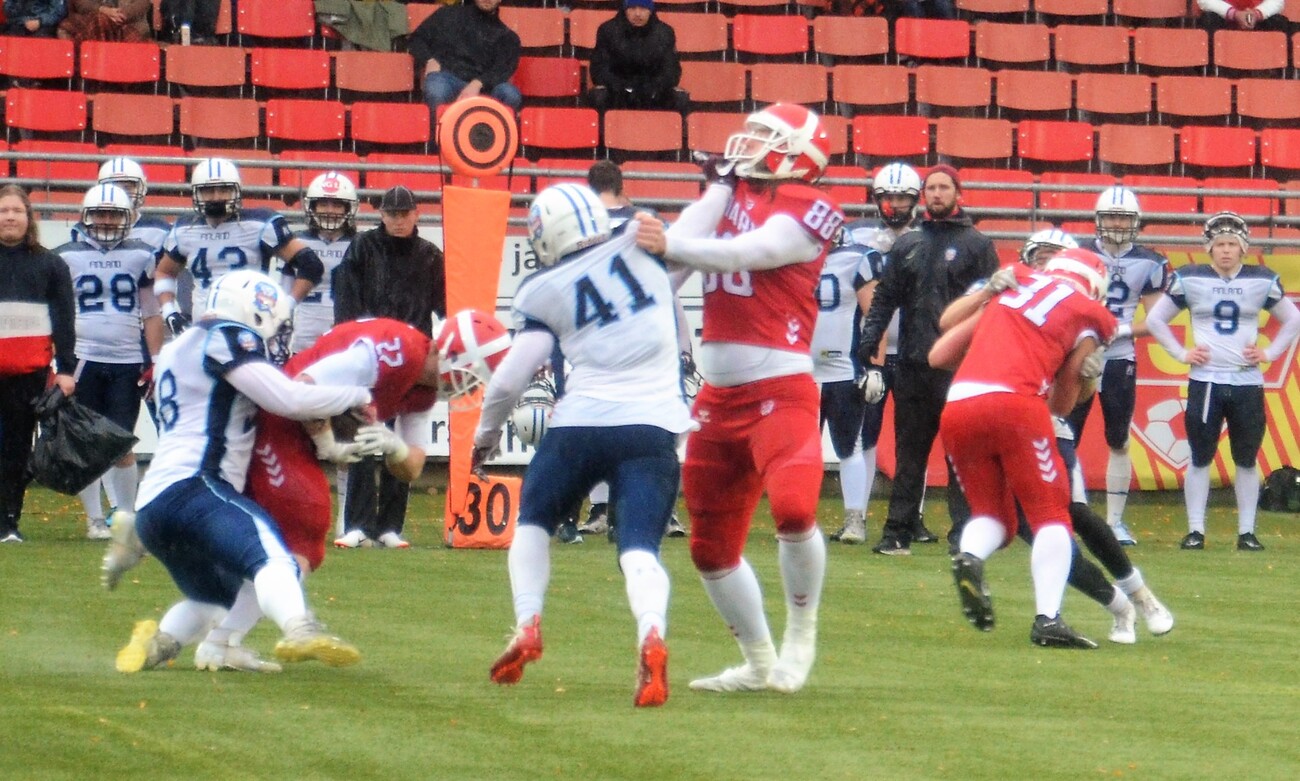 Vantaalla pelatussa Tanska-ottelussa Suomi oli hallitsevassa roolissa. Maiden ensimmäinen miesten tasolla käyty kamppailu päättyi Suomen voittoon 44-3 (20-3). Ensimmäisellä neljänneksellä Tanska kulutti aikaa ja piti palloa. Pelinrakentaja Thomas Zinck Thellufsen oli pirteällä pelipäällä ja toi joukkueelleen omilla juoksuillaan tärkeitä ensimmäisiä yrityksiä. Ville-Valtteri Suojanen ja Janne Kreuss pelasivat tarkasti kolmannet yritykset. Tanskan linjapuolustaja Mads Nielsen onnistui säkittämään pelinrakentaja Kadmiryn. Suomen lentopotku jäi lyhyeksi ja jälkitilanteessa Tanskan Lasse Lykke eteni pallon kanssa jo 5 jaardin päähän Suomen maalista. Suomen puolustus pysäytti kolme yritystä ja 4. yrityksenä Tanska potkaisi ottelun ainoat pisteet 0-3 Aske Klixbülin kenttäpotkumaalilla. Mickey Kyei palautti aloituspotkun yli puolen kentän. Sitten alkoi Suomen palloralli, jossa Veikka Lehtonen ja Miro Kadmiry vuorottelivat pallonkantovuoroissa. Tukimies Jimi Laursen taklasi screen-pelin miinuksille. Mutta Suomi jäi neljänneksen lopussa hyviin asemiin. Tanska hallitsi hienoisesti ensimmäistä neljännestä ja johti ottelua 0-3. Suomi nousi valta-asemaan toisella neljänneksellä. Karri Pajarinen kiitti linjan blokkityöskentelystä ja teki Suomen avausmaalin heti 2. neljänneksen alkajaisiksi. Roope Niskanen potkaisi lisäpisteen. Suomi johtoon 7-3. Puolustuskoordinaattori Karppisen joukot olivat valppaana seuraavan yritysvuoron ja pakottivat tanskalaiset lentopotkuun. Upea pitkä heittopeli Sebastian Sagnelle toi Suomen red zonelle. Tom Suoste jatkoi siitä mihin Pajarinen jäi ja toi Suomea lähemmäksi maalilinjaa. Hyökkäysvuoron päätti Mikko Seppänen, joka juoksi itsensä vapaaksi ja teki heittomaalin maalialueen kulmassa. Suomi johtoon 14-3. Suomi otti kenttäasemataistelun haltuun. Tuukka Lehtoselle avautui valtava latu ja hän suihki itsensä lähelle Tanskan maalia. Mickey Kyei otti kaksi heittoa kiinni ja lisäsi johtoa 20-3. Niskanen potkaisi tolppaan kolmannen lisäpistepotkunsa. Janne Kreussin syliväli oli käytössä koko mitassaan ja hän teki jälleen ratkaisevan taklauksen Suomen pysäyttäessä Tanskan hyökkäyksen kolmen yrityksen jälkeen. Tämän jälkeen Suomi alkoi hieman ahnehtia hyökkäyspuolella ja märät pallot aiheuttivat harmaita hiuksia pelinrakentajille. Tanska sai syötönkatkoja ja mahdollisuuden tasoittaa ottelua. Suomi sai ensimmäisen neljänneksen viimeisellä minuutilla pallon haltuun. Tanskalaistukimies rikkoi Ville Karhista roikkumalla hänen selässään heiton aikana. Jatkotilanteessa Tanska sai kolmannen syötönkatkon Lau Hartoftin toimesta. Keskushyökkääjä Veikka Lehtonen pelasti lähes varman maalin ja Tanska pääsi vielä kerran yrittämään pisteiden tekoa. Ville-Valtteri Suojanen puolusti varmasti pelipuoliskon viimeisen heiton. Kolmas neljännes aloitettiin Suomen pirteällä hyökkäyspelillä. Karri Pajarisen pomppukoppi vei Suomen hyviin asemiin. Leijonat pääsivät kahden tanskalaisrangaistusten johdosta muutaman jaardin päähän maalista. Veikka Lehtonen ponnisti maaliin Seppo Evwarayen ja Martin Veinbergin muodostaman seinän takaa. Roope Niskanen potkaisi tilanteeksi 27-3. Tanska jatkoi taistelua, mutta menetti otteen pallosta ja ensimmäistä maaotteluaan pelannut linjapuolustaja Toni Lindholm peitti pelivälineen. Seuraava vuoro käytettiin tarkasti juosten.Tom Suosteen ja Tuukka Lehtosen jakaessa vastuuta. Suomi eteni vääjäämättömästi kohti Tanskan maalia. Suomen hyökkäyslinja toimi kuin palomuuri ja ei päästänyt tanskalaisviruksia pallonkantajien kimppuun. Tuukka Lehtonen jatkoi paukutusta ja johto kasvoi 34-3 numeroihin. Seuraavakin mahdollisuus käytettiin hyväksi. Kahden juoksupelin jälkeen Veikka Lehtonen teki toisen maalinsa pelipuoliskolla. Myyrmäen jalkapallostadionin sähköinen tulostaulu näytti numeroita 41-3. Kun pelikellossa oli jäljellä seitsemän minuuttia viimeisteli Roope Niskanen kenttäpotkumaalin ja kasvatti Suomen voittonumeroiksi 44-3. Maiden ensimmäinen maaottelu miesten tasolla päättyi Suomen ylivoimaiseen voittoon. Game MVP Finland de Edward Vesterinen