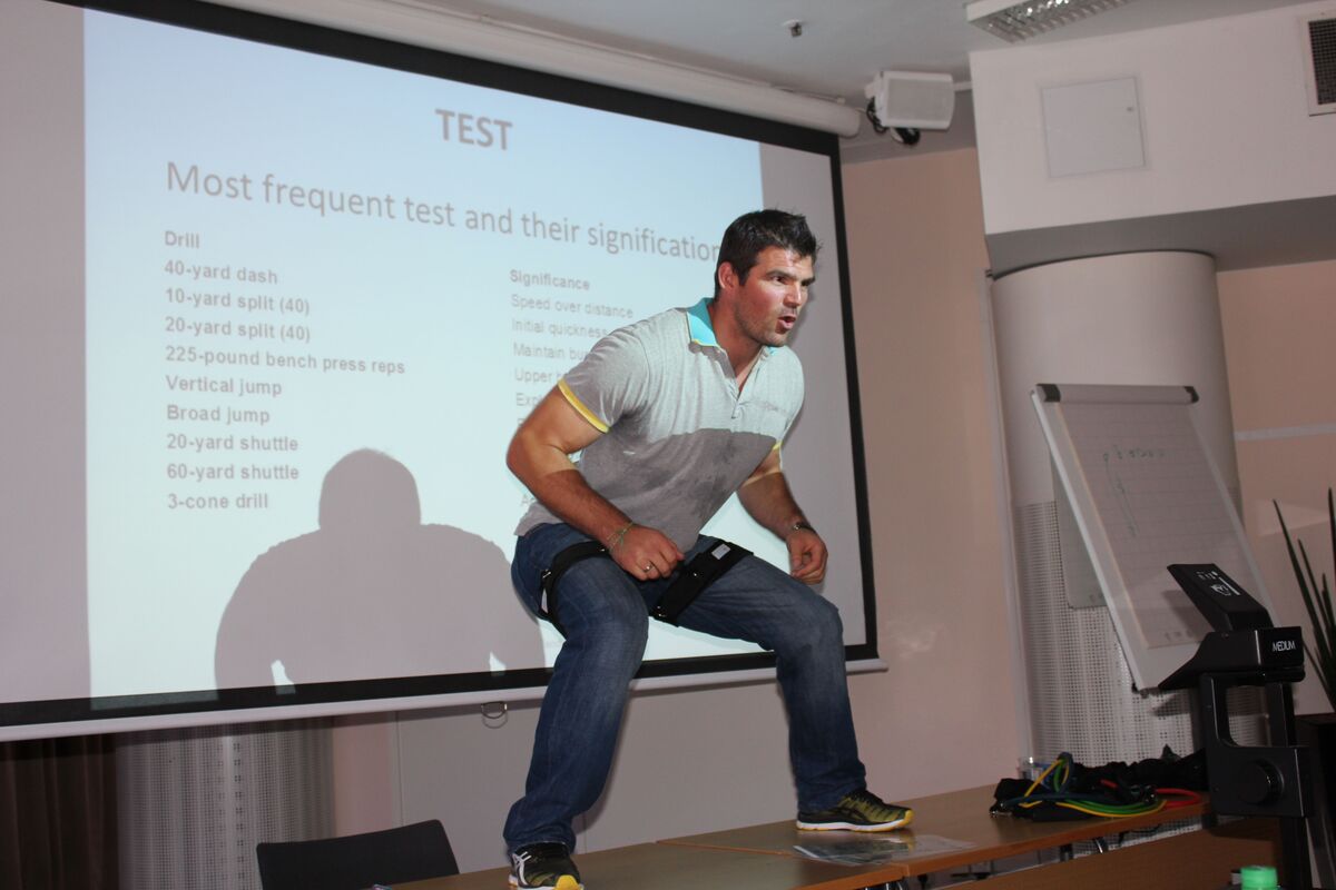 Jim Crinerin luentojen pääaiheena oli moderni spread option-hyökkäys ja sellaista vastaan puolustaminen. Criner näkee pistol/shotgun-option hyökkäyksen sopivana eurooppalaiseenkin peliin mm. seuraavista syistä: - QB:n asema kauempana linjasta kuin perinteisessä optionissa helpottaa lukuja, ’exchange point’ on helpompi. - OL perusblokit ovat yksinkertaisia oppia ja opettaa (down/combo, 2 vs 1) - read-konsepti antaa ’yhden blokkaajan lisää’ - hyökkäystapa pakottaa puolustuksen takakentän juoksuun, avaa playaction-heittoja - vähentää syötönkatkoja, pääosin helppoa lyhyttä heittoa levitettyyn puolustukseen - pakottaa muodostelmien määrällä, shifteillä ja motioneilla puolustuksen mukautumaan Nimestään huolimatta Crinerin esittelemä hyökkäystapa ei ollut ’pelkkä’ option, pakettiin kuului perusjuoksua, screenejä, playaction-heittoa jne. Pääajatus taustalla oli hyökkäystavan tehokkuus ja sen opettamisen ja oppimisen helppous. Criner nimenomaan korosti hyökkäyksen monipuolisuuden tärkeyttä tarkkaan rajatuilla ja rakennetuilla elementeillä. Criner esitteli myös spread optionin puolustamista 34-, 43- ja 46-esimerkein. Hyökkäyksen rytmin ja ajoitusten ollessa hiukan perinteisestä poikkeavaa, pitää puolustuksen pelaamisenkin hiukan muuttua. Esim. linebackereiden etäisyyttä aloituslinjasta voi ja kannattaakin hiukan pidentää sivuttaisen liikkumisen mahdollisuuden varmistamiseksi ja siksi että pistol- ja shotgun-pelit eivät käytännössä voi iskeä linjaan yhtä nopeasti kuin esimerkiksi perinteisen option-hyökkäyksen dive. Philippe Gardent luennoi LB-pelaamisen perusteista stancesta alkaen. LB:n lperusiikkuminen, blokin voittaminen ja taklaaminen käytiin huolella läpi, samalla hyviä drillejä esitellen. Gardent suositteli valitsemaan drillit joita tehdään joka päivä sekä pysymään niissä ja käyttämään lämmittelyjä lisäaikana niiden teettämiseen. Coaching pointeja max 2-3 per harjoite, ja yleisesti koko joukkueen valmentajistolle ohje opettaa samoja tekniikoita. Gardentin toinen pääaihe oli fysiikan kehittäminen. Hän esitteli pelipaikkajakoisen listauksen lajin fyysisistä vaatimuksista ja keskittyi luennossaan nopeuden, suunnanmuutosnopeuden ja räjähtävän voiman kehittämiseen. Kattavassa luennossaan Gardent ehti käymään läpi herkkyyskausia, fysiikka- ja lajiharjoitteiden yhdistämistä sekä voiman eri osa-alueita ja niiden vahvuuksien ja heikkouksien tunnistamista ja merkitystä. Lynn Stilesin osuudet klinikalla olivat hiukan toisenlaisia luonteeltaan kuin muiden. Stilesilla on takanaan 30:n vuoden valmennusura NFL:ssä ja jo sitä ennen menestyksekäs Div1A-ura. Miehellä on neljä Super Bowl-sormusta, joista yhtä sai Suomessakin mukana ihailla. Stilesin luennot eivät seuranneet aiheiltaan tarkasti etukäteen saatua listausta, ja hän aloitti jokaisen osuuden kuvailemalla arvoja, ihmisyyttä, johtajuutta, asioita ja ilmiöitä jotka saavat joukkueen menestymään. Huikeaa kuunneltavaa mieheltä joka on toiminut valmentajana joukkueissa joissa ovat pelanneet mm. Joe Montana, Steve Young, Jerry Rice, Ronnie Lott jne jne. Stilesin esityksistä varmasti moni sai itselleen mukaan sanoissa lyhyitä lauseita joiden takana on isoja valmennuksellisia ajatuksia. Klinikka oli menestys, valmentajien teettämässä palautekyselyssä 90% vastaajista ilmoitti tulevansa samanlaiselle uudestaan kun sellainen järjestetään. |