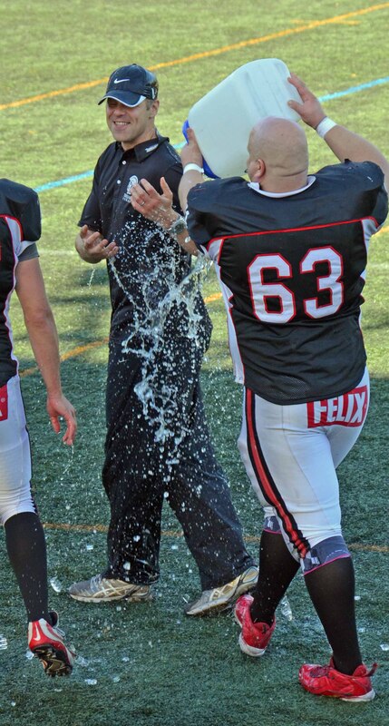 ![Trojansin päävalmentaja Mikko Virolainen saa perinteisen kylmän suihkun.]()