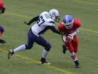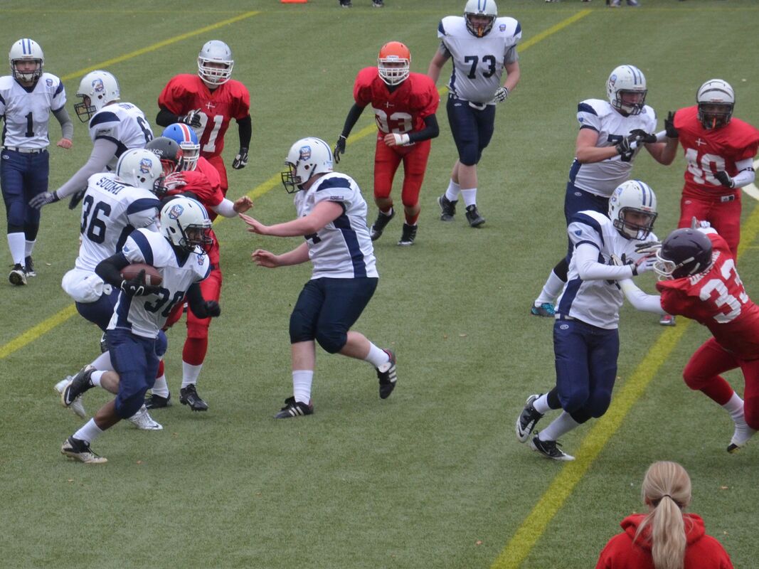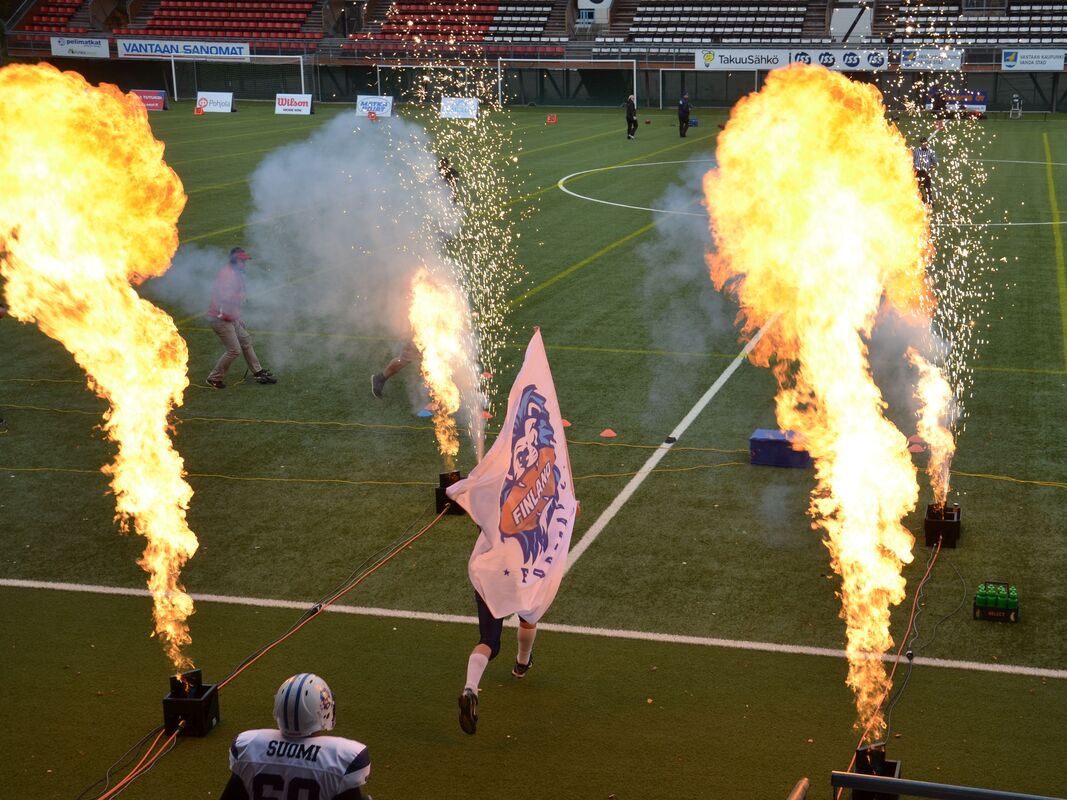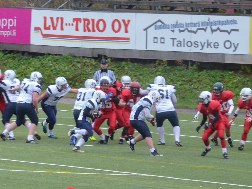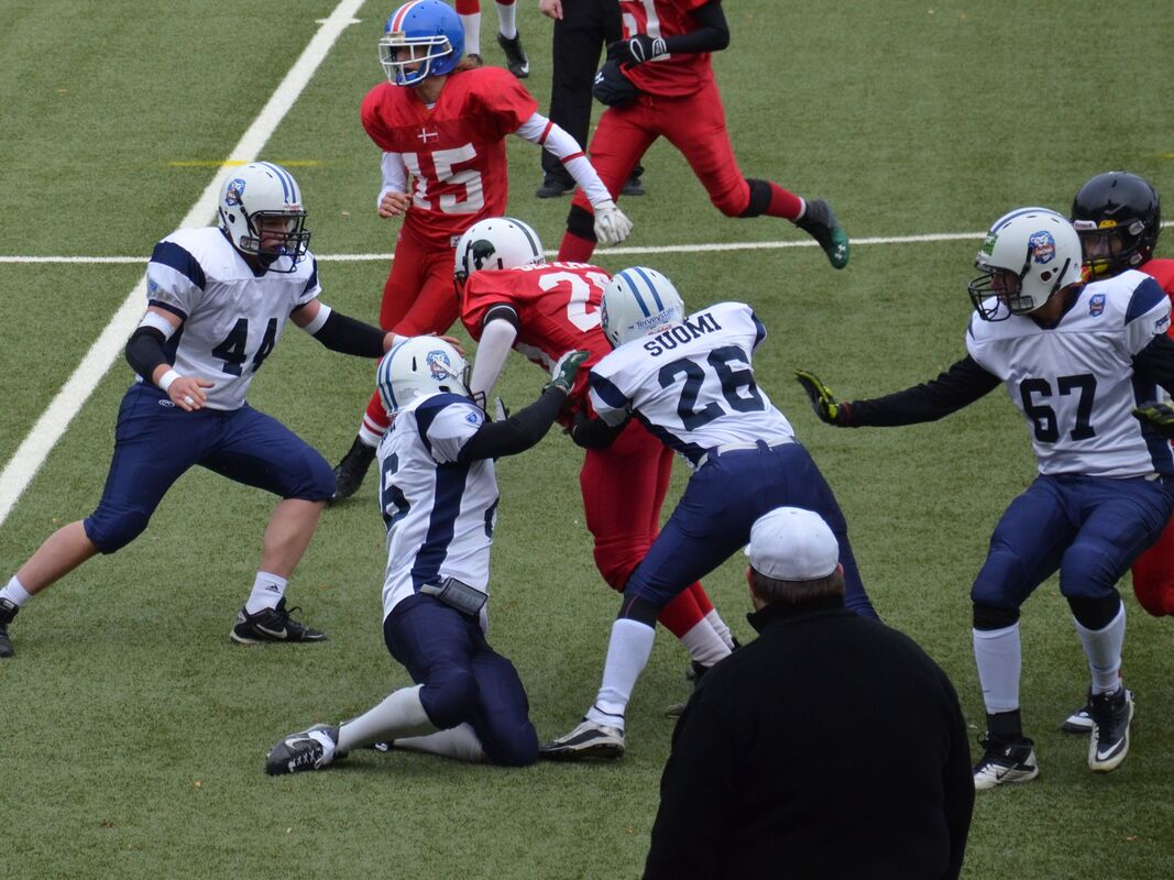 PM-kisojen avausottelussa Suomen ja Tanskan kakkosjoukkueilla oli tiukka ottelu, joka päättyi dramaattisen vaiheiden jälkeen Suomen voitoksi viime hetken heittomaalin ansiosta. Ottelu alkoi Tanskan lyhyellä potkulla. Luis Acao otti muutaman jaardin siivuja, mutta Suomi pakotettiin lentopotkaisemaan. Lentopotkun aloitussyöttö oli liian korkea ja Tanskan Andreas Ekelund pääsi lopulta tekemään irtopallosta maalin. Lisäpisteen onnistuessa Tanska johti 7-0. Fullback Toni Ahonen veti hyvällä rytinällä uudet yritykset. Luis Acao otti mahtavan kirmaisun ja eteni kolmenkymmentä jaardia. Suomi pääsikin 10 jaardin päähän maalista, mutta pelinrakentaja Kaarnakarin ja Acaon pallonvaihto epäonnistui ja Tanska piti maalialueensa puhtaana. Suomen puolustus piti hyvin ja Tanska oli pakotettu potkaisemaan. Suomi sai erinomaisen kenttäaseman puolestavälistä kenttää. Taftin Joni Lindholm kantoi lähes peräjälkeen palloa kuusi kertaa edeten 54 jaardia. Suomen linjassa oikealla puolella hankolaiskaksikko ja vasemmalla turkulaislinjamiehet. Joni Lindholm juoksi väkivahvasti 7 jaardia maaliin Vili Kujanpää veti hyviä blokkeja. Lindholm juoksi myös lisäpisteet Suomen mennessä johtoon 7-8. Tanska pääsi uusiin yrityksiin mutta hyvin joukkueena puolustanut Suomi piti jälleen puolensa. Hyvinkään Niklas Reinhardt taklasi. Tanskan hyvä onni jatkui ja se sai ilmaiseksi pallon Suomen rähmätessä pallon ensimmäisellä yrityksellään. Janne Sipilä pääsi vuorostaan irtopallon kaapimaan itselleen ja Suomi hyökkäsi uudelleen. Luis Acao oli pallonkantovuorossa ja hän käytti vikkelyyttään ja periksiantamatatonta pelityyliään hyväksi ja eteni kiertopeleillä. Tanska sai kolmannen turnoverin Micke Kaarnakarin heittäessä syötönkatkon. Suomen puolustus oli kuitenkin taas kärppänä peittämässä irtopalloa tällä kertaa Kuopion Kalle Tanninen peitti irtopallon. Luis Acao kiitti pallonkantovuorosta ja siivutti jälleen 8 jaardin verran palloa eteenpäin. Joni Linholm kävi ei suostunut kaatumaan ensimmäiseen iskuun ja Suomi toi palloa väljemmille vesille. Hyökkäysvuorossa ei kuitenkaan saatu uusia yrityksiä ja Tanska sai pallon kun pelipuoliskoa oli jäljelleä minuutti. Tanskan screeni alusti heittopelin, jossa Victor Stauning teki suomalaisten törmäillessä maalin. Rasmus Landbo potkaisi taukojohdoksi 14-8. Suomi menetti pallon kertaalleen aloituspotkussa ja Tanska pääsi kokeilemaan vielä kerran hyökkäystään. Jere Salejärvi taklasi ensimmäisen heiton ja toisen. Suomi menetti pallon neljästi ensimmäisellä jaksolla. Kolmannen jakson alku oli tasaista vääntöä. Suomi pysäytti Tanskan kahdesti. Suomi jakoi pelinrakentajavastuuta ja uusi pelinrakentaja Heikki Toivola onnistui heti heitossaan Niko Saarijärvelle. Hyökkäyksen koordinaattorina toiminut Aki Ollenberg jakoi pallonkantovastuuta Joni Lindholmin, Samu Teleniuksen sekä Luis Acaolle välillä. Suomi eteni kahden jaardin päähän maalista. Luis Acao kiitti kunniasta ja juoksi tilanteen tasanumeroihin 14-14. Suomen linja teki hyvää jälkeä ja Acao teki Suomen johtonumeroiksi 14-16 lisäpistejuoksullaan. Rasmus Pedersen nostatti Tanskan joukkoja ja purjehti 10 jaardin päähän pitkällä pallonkannollaan. Tanskan pelinrakentaja Emil Sörensen juoksi johtomaalin lähietäisyydeltä. Lisäpistepotku epäonnistui. Tanska johti kutkuttavasti 20-16. Suomi aloitti neljännellä jakson puolessavälissä ankaran takaa-ajon. Joni Lindholm jatkoi periksiantamatonta juoksuaan ja toi Suomen hyökkäystä eteenpäin kymmenen jaardin siivuilla. Luis Acao toi omat mausteensa otteluun, mutta pahaksi onnekseen menetti pallon tärkeässä paikassa. Tanska sai pallon ja aloitti hyökkäysvuoronsa. Team MVP Denmark DB Andreas Eklund