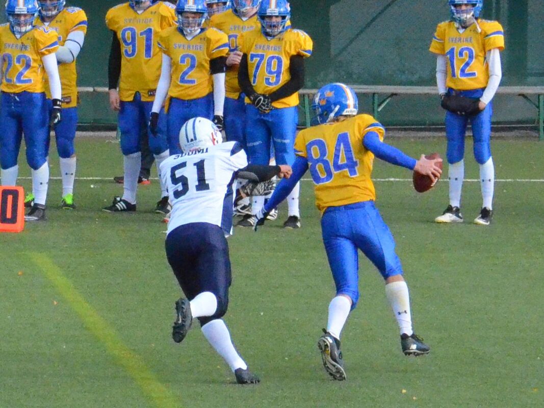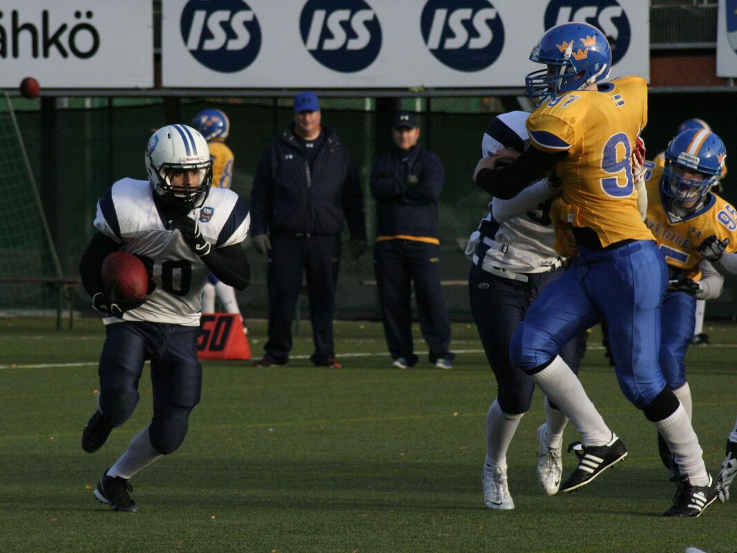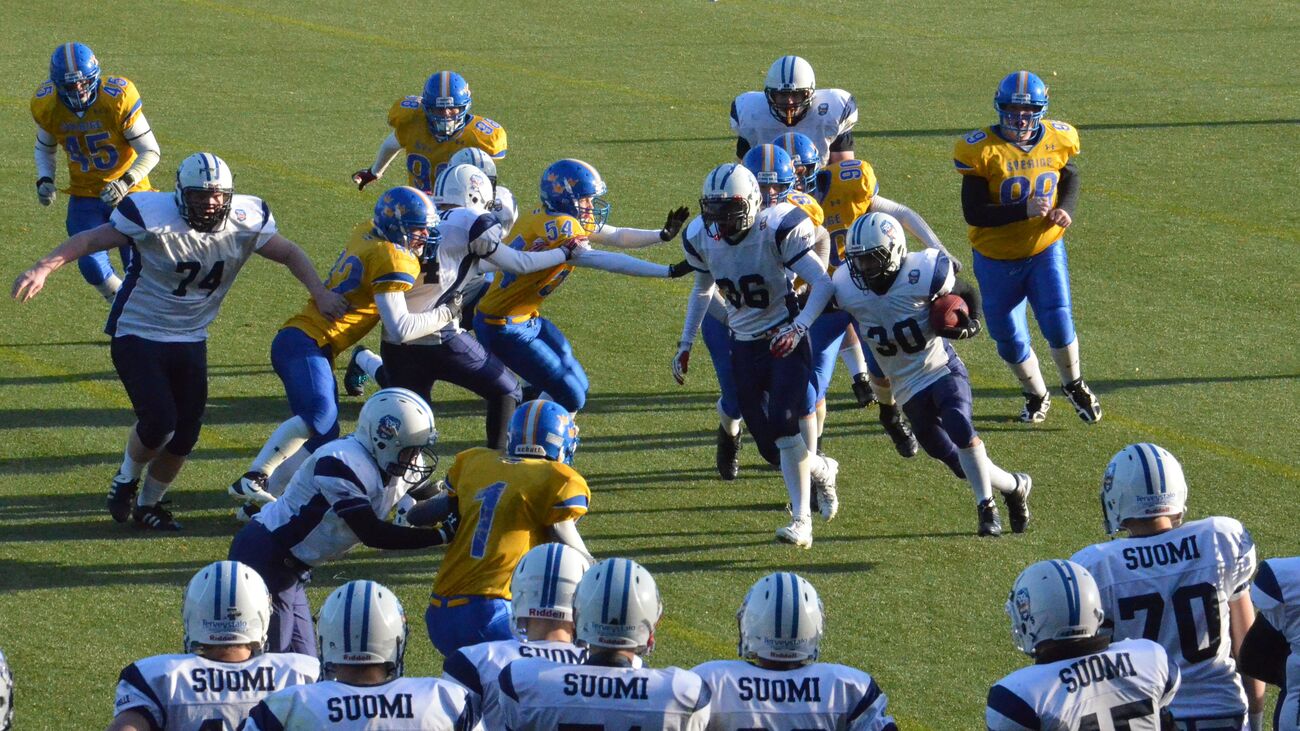 Suomen kehitysjoukkue oli turnauksessa voittamaton. Suomen sisukas Luis Acao oli ensimmäinen vastuunkantaja kun Suomi aloitti hyökkäämään. Joukkue eteni tasaisesti ja pääsi ruotsalaisten kolmen rangaistuksen johdosta 8 jaardin linjalta yrittämään maalintekoa. Joni Lindholm onnistui juoksemaan maalialueelle, mutta kiinnipitorangaistus vei pisteet. Micke Kaarnakarin onnistunut heitto ei aivan riittänyt maaliin asti.Suomi käytti hyökkäyssarjaan lähes kahdeksan minuuttia peliajasta. Suomen puolustus oli terävänä ensimmäisen kerran astuessaan kentälle ja pysäytti Ruotsin kolme hyökkäysyritystä. Suomi pyrki juosten kohti maalia, mutta Ruotsin puolustus onnistui yritys yritykseltä paremmin Suomen tavaramerkin linjaläpijuoksujen pysäyttämisessä. Suomi eteni ensimmäisellä puoliskolla 29 jaardia. Toisella neljänneksellä näyttämöllä esiintyi pääosissa molempien joukkueiden puolustukset. Ruotsi oli kentällä ainoastaan 13 hyökkäysyritystä. Suomen tukimies Tino Hietala teki aktiivisesti taklauksia. Puoliaikatilastoksi kirjattiin 0-0. Nooa Hirvonen aloitti toisen pelijakson mahtavalla kolaustaklauksella Suomen aloituspotkujoukkueessa. Ruotsin kohtuullisen hyökkäysvireen katkaisi Suomen linjapuolustaja Dennis Ilmelä, joka pääsi ensimmäisenä pelinrakentajalta tipahtaneen pallon kimppuun. Suomi hyökkäsi 25 jaardin linjalta sisukkaasti, mutta vailla tulosta. Pelinrakentajksi vaihtunut Heikki Toivola heitti vaikeaan paikkaan ja Ruotsi katkaisi heiton.