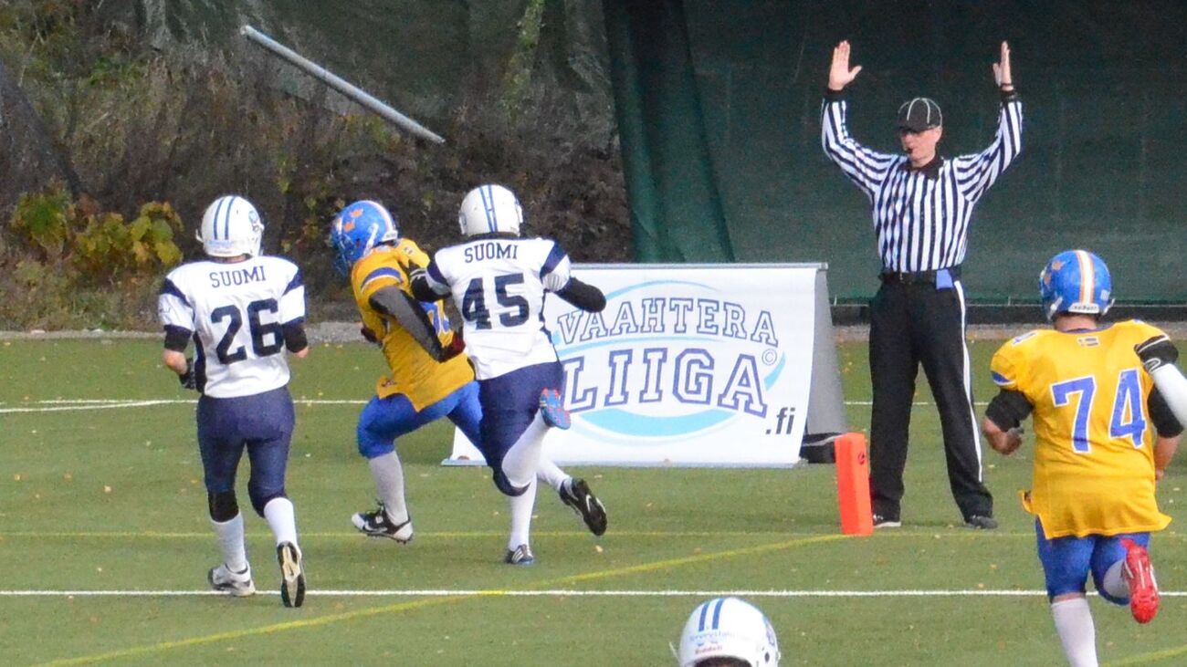 Neljännellä jaksolla Ruotsi ei luovuttanut ja Adrian Medrala onnistui kaventamaan tilanteen 16-6 numeroihin sivurajalle suuntautuneen heiton päätteeksi. Onside potku yllätti suomalaiset, mutta pallo pomppi sivurajasta onneksi yli. Suomen hyökkäysvuorolla ei tullut pisteitä. Ruotsi suoritti vielä seuraavassa hyökkäysvuorossaan tupla-heiton, jossa laitahyökkääjä heitti aivan vapaaksi jääneelle kiinniottajalle. Pallo ei kuitenkaan jäänyt ruotsalaiskäsiin. Suomen takakenttä piti ruotsalaispommituksen tuloksettomana ja antoi hyökkäykselleen mahdollisuuden kuluttaa kellosta ajan loppuun. Toinen voitto PM-turnauksessa kirjattiin aikakirjoihin 16-6. Suomen kehitysjoukkue oli turnauksessa voittamaton. U17 kehitysjoukkueen päävalmentaja Rami Lilja oli tyytyväinen PM-turnaukseen. - Olen todella ylpeä pojistamme. Ei voi puhua mistään kakkosjoukkueesta, sillä jokainen pelaaja pelasi kovalla intensiteetillä ja osoitti olevansa maajoukkuepelipaikan arvoinen. Valmennustiimi teki myös hyvää jälkeä vaativissa olosuhteissa. Tiukat ottelut saatiin käännettyä voitoiksi. Siitä on hyvä jatkaa. Team MVP Sweden qb Jonathan Paul Team MVP Finland ol Vili Kujanpää Game MVP Finland lb Tino Hietala |
