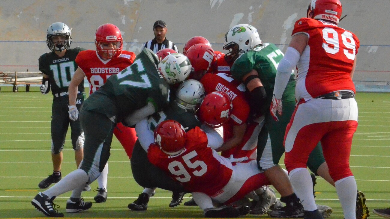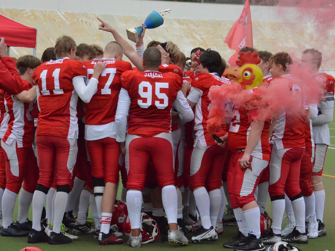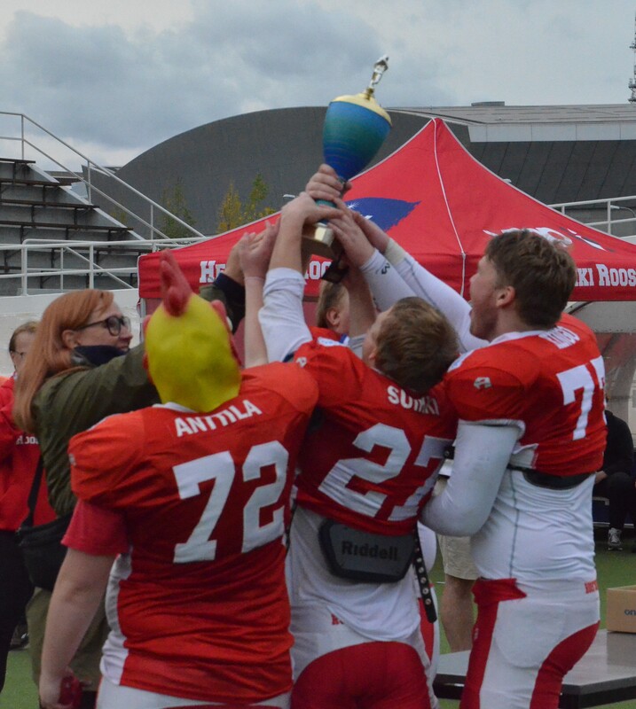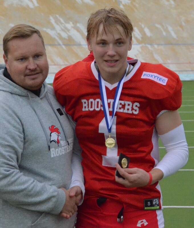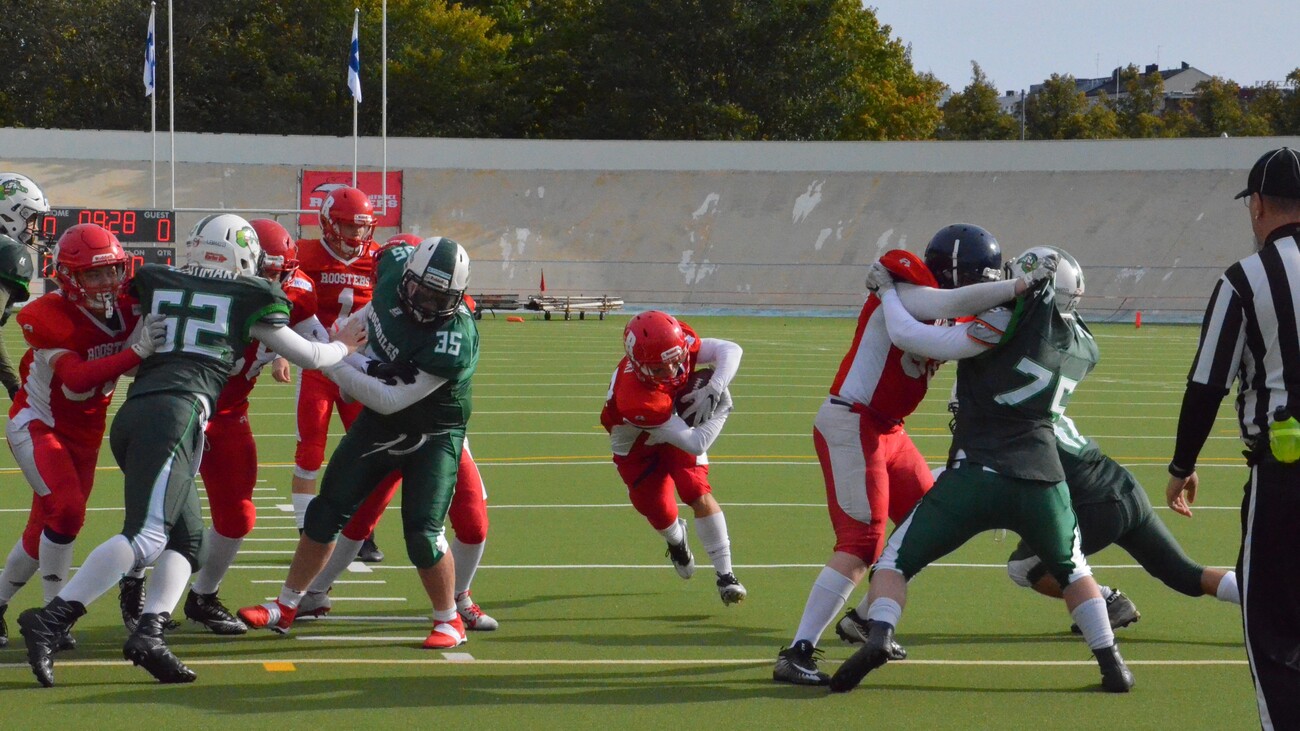Velodromilla pelatussa hyvätasoisessa ottelussa Seinäjoki Crocodilesin ja Jyväskylä Jaguaarinen yhteispeto Dragons joutui taipumaan 28-7 Helsinki Roostersille (14-7). Pelinrakentaja Lassi Pajarisella oli neljän maalin iltapäivä. Tuulinen iltapäivä houkutteli Velodromille kolmisensataa katsojaa. Helsinki Roosters oli järjestänyt tyylikkään tapahtuman, jossa musiikki ja kenttäkuulutus toimivat sujuvasti. Myös puoliaikaohjelmaan oli satsattu, kun yleisö sai ihastella Step Up -katutanssiryhmää ja skate-punkia soittaneen Jassen Kumiveneen energista menoa. Itse finaalissa Dragons aloitti hyökkäämisen ottelun alussa hermostuneesti. Rangaistukset ja Roostersin linjapuolustaja Malek Jaradatin säkitys vei joukkuetta taaksepäin. Vierailijat menettivät kenttäasemansa epäonnistuneen lentopotkutilanteen jälkeen ja Roosters pääsi hyökkäämään maukkaista lähtöasetelmista 21 jaardin päästä maalista. Roosters eteni lopulta yhden jaardin päähän maaliviivasta, mutta Dragons puolusti vimmatusti maalialuettaan. Linjapuolustaja Riku Lehtimäki ja tukimies Aapo Taipale taklasivat pallonkantajan miinusjaardeille. Keskushyökkääjä Henri Suikki livahti kertaalleen maaliin, mutta rangaistuksen johdosta pistesuoritus hylättiin. 2. neljänneksen alkuminuutilla Roosters pääsi hyvään hyökkäysrytmiin, kun ensin Aatu Mikkonen kipitti 17 jaardia soikean pallon kera yli puolen kentän. 190cm tight end Gustav Wahlstein otti pitkän heiton kiinni ja toi joukkueensa kuuden jaardin päähän maalista. Pelinrakentajana toiminut Lassi Pajarinen hyppäsi lopulta lähietäisyydeltä NFL-tyyliin ottelun ensimmäisen maalin. Anssi Ruohonen potkaisi lisäpisteen ja kotijoukkueen johtoon 7-0. Lohikäärme-jengi aloitti kolmannen jakson pirteästi ja onnistui blokkaamaan Roostersin lentopotkun. Tuomas Järvenpää syöksyi pallon lentoradan eteen ja Aapo Taipale peitti irtopallon. Hyökkäysvuorossa Dragons eteni ensin lupaavasti Samu Hautalan screen-pelillä. Linjapuolustaja Malek Jaradat teki toisen säkityksen juuri kreivin aikaan 3. yrityksellä, kun Dragon oli saapunut maalintekoalueen porteille. Syötön vastaanoton häirintä -rangaistuksen johdosta Dragons pääsi 12 jaardin päähän. Tasaisesti pelanneen Roosters puolustuslinjan Felix Lehtonen teki kaksi onnistunutta pysäytystä juoksutaklausten muodossa. Kaksi seuraavaa heittoa eivät onnistuneet. Numerolla #1 pelanneen Lassi Pajarisen kolmas maali oli komea 60-jaardinen yksinpurjehdus, jossa hän ensin hämäsi palloa keskushyökkääjilleen ja kääntyi omaan juoksuun. Roosters johti 20-7, kun Dragonsin Aapo Taipale blokkasi lisäpisteen. 4. jakson alkuvaiheessa terävästi pelannut Henri Suikki otti toisen syötönkatkonsa ottelussa. Helsinkiläisten seuraavan hyökkäysvuoron päätti Lassi Pajarinen 9-jaardin pituisella juoksulla. Henri Suikki teki ottelun viimeiset pisteet 2-pisteen lisäpistejuoksulla. Finaalin loppulukemat 28-7. Dragonsin valmennus ei saanut joukkueestaan tällä kertaa enempää irti. Yksi finalistien ero oli yhteispelaamisessa. Jyväskylän ja Seinäjoen nuori joukkue oli saanut keväällä yhteisleirien avulla hyvän yhteissävelen, mutta syksyä kohti yhteiselle treenaamiselle ei jäänyt paljolti aikaa johtuen mm. U15 SM-sarjasta, jossa molemmilla seuroilla on omat joukkueet. Lähes 40 pelaajan tiimistä menee yli-ikäiseksi vain kahdeksan pelaajaa. Osa jaguaari-nuorukaisista jatkaa kultamitalijahtia U15 finaalissa Helsinki East City Giantsia vastaan 26.9. Helsingissä. Itävallasta kotoisin oleva Roostersin vastuuvalmentaja Daniel Stanzel oli saanut joukkueensa hyvään iskuun. Kolmipäinen nuorisohirviö Lassi Pajarinen-Henri Suikki- Aatu Mikkonen pelasi palloa hyvillä tehoilla. Puolustus ei taipunut ottelussa kuin kerran. Okko Outinen kehui puolustuslinjan esitystä. Hyvähenkinen kukkolauma pelasi maltillisesti läpi ottelun. Edellisen kerran Roostersille jaettiin kultaiset mitalit vuonna 2016. Puolustuslinjan reunassa ja potkaisijan pelannut Eetu Mäki-Maunus pelasi väkevän ottelun ja hänet palkittiin Dragons Team MVP-pelaajana. Roostersin Team MVP oli Mäkelänrinteen urheilulukiossa opiskeleva Henri Suikki, joka antoi vahvan panoksen niin puolustuksessa, hyökkäyksessä kuin erikoisjoukkuepeleissä. Ottelun Game MVP oli kentän kiistaton ykköshahmo Lassi Pajarinen. Joukkueensa kaikki maalit viimeistellyt veljessarjan nuorin futari omaa vahvat jalat ja kilpailukykyisen nopeuden. Lisäksi hän osoitti potkunpalautuksissa olevansa ikäryhmänsä ykkönen tässä taidossa.