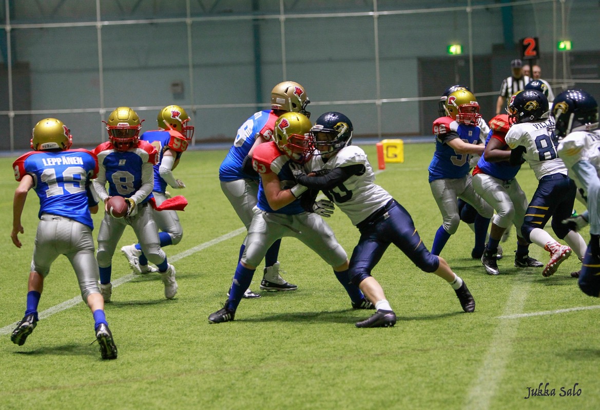 Vuoden 2020 U13-nuorten SM-finaalissa kohtasivat Wasa Royals ja Helsinki Wolverines. Wolverines voitti tiukan kamppailun lukemin 34-38. Vaasalaiset olivat voittaneet kaikki kuusi runkosarjan otteluaan ja lähtivät finaaliin ennakkosuosikkeina. Edellinen kohtaaminen ratkesi hyökkäyskilpailussaFinalistit pelasivat jo runkosarjassa äärimmäisen jännittävän keskinäisen ottelun. Helsingin Brahen kentällä peli eteni aina hyökkäyskilpailun toiselle kierrokselle, jossa vaasalaiset onnistuivat ratkaisemaan pelin sekä runkosarjan voiton Pohjanmaalle. Royalsin hyökkäyspeli on kauden aikana perustunut huippulahjakkaan Raul Khalifan vahvaan juoksupeliin. Vaahteraliigassa ja maajoukkueessa pelaavan isoveljensä jalanjäljillä kulkeva Raul on takonut joukkueelleen pisteitä taululle tasaiseen tahtiin läpi kauden. Myös finaalipelissä kaikki Royalsin maalisuoritukset kirjattiin Khalifan nimiin, viisi touchdownia sekä kaksi lisäpistesuoritusta (2p) Monipuolinen pelivalikoima ratkaisi mestaruudenWolverines päävalmentaja Veikko Viuhan mukaan voiton avaimina oli finaalipelisissä monipuolisuus: -Meillä mukavasti pääsi useita pelaajia pisteiden makuun. Hyökkäys oli tasapainoinen heitto- ja juoksuhyökkäys, joten etenkin ottelun ratkaisseet lisäpisteet olivat hyvien play action pelien ansiota. Peli oli kovatasoinen ja tasainen ja täytyy antaa vastustajalle tunnustusta viime sekunteihin asti yrittämisestä Mestarijoukkueen valmentajat valitsivat omaksi MVP:ksi numerolla 11 pelanneen Eelis Naamangan. Eelis onnistui pysäyttämään Royalsin Khalifan juoksut ratkaisevilla hetkillä ja antoi joukkueelleen mahdollisuuden voittaa pelin. Molemmat joukkueet tekivät 5 touchdownia, joten ratkaiseviksi osoittautuivat onnistumiset lisäpistepeleissä, joissa Wolverines onnistui pysäyttämään Royalsin kaksi kertaa useammin. Wolverinesin joukkueesta eniten pisteitä kirjasi tililleen pelinrakentaja Sifiso Salama, joka neljännellä neljänneksellä onnistui touchdownissa kolmesti sekä kuljetti pallon maaliin lisäpistesuorituksellaan kertaalleen. -Kundit ja tytöt jaksaneet treenata ahkerasti ja tunnollisesti ja uudet lajiin pariin tulleet saatiin tehokkaasti mukaan joukkueeseen. Tämä palkittiin tänä vuonna mestaruudella. Viuhan valmentamassa mestaruuden voittaneessa joukkueessa pelasi poikien rinnalla kaksi tyttöä. Joukkueen nuorimpana kentällä kolisteli Wilma Naamanka. 13-vuotias Pihla Viuha ehti U13-sarjan ohella käydä pelaamassa myös kauden ainoan tyttöjen pelin U20 ikäluokassa. Pisteet