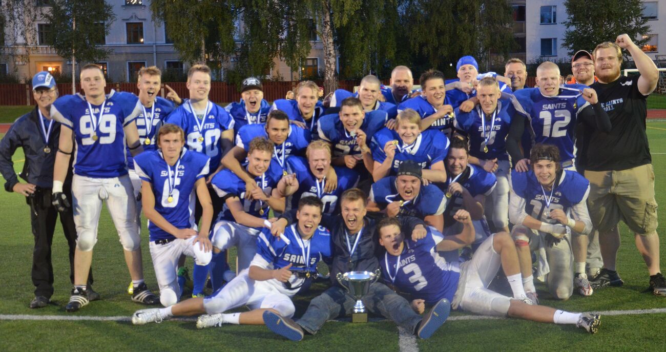 14-20 Thomas Salenius heitti Jaakko Koivuselle 27 jaardin pitkän heiton, jolla Saints pääsi hyvään kenttäasemaan. Laitahyökkääjä Juuso Jylhä ja maalasi toistamiseen 6 pisteen arvoisesti. Lisäpistepeli epäonnistui. 14-28 (PUOLIAIKA) Oskar Drockila jatkoi hyviä otteitaan ja otti omilla jaloillaan lisäaikaa heitoilleen. Jakson loppusekunneilla Drockila scramblasi mallikkaasti ja heitti maalialueen kulmaan juosseelle Alexander Wasiljeff maalin. Wasiljeff onnistui myös lisäpelissä. 3.neljännes Tampere Saints- Helsinki 69ers 22-28 Tuukka Lehtonen nostatti sinipaitojen tunnelmaa palauttamalla aloituspotkua 62 jaardia. Saints luotti edelleen muskelijuoksuunsa ja Jaakko Koivunen toi pelivälinettä vahvasti eteenpäin. Kimmo Jokinen teki joukkueen kavennusmaalin neljän jaardin päästä. Lisäpistepelissä qb Salenius löysi Juuso Jylhän kahden pisteen arvoisesti. 22-34 Timofei Telov toi aloituspotkua 35 jaardia ja varmisti joukkueelleen hyvän kenttäaseman. Pelin panokset kohosivat. Tuukka Lehtonen jatkoi väkivahvaa peliään puolustuksen linjassa ja Oskar Drockila joutui heittämään useasti vaikeista paikoista ja päätyi usein juoksemaan pallon kanssa. Saintsin takakenttä tiivisti henkilövaihdosten johdosta otettaan. Sivurajan tuntumassa tehdyn Saints-taklauksen johdosta 69ers pääsi jälleen lähelle maalia. Timofei Telov oli tehokkaalla päällä ja hän pystyi lisäämään helsinkiläisten johtoa 7 jaardin kiinniotolla. Saintsin Benjamin Ylipää onnistui pysäyttämään lisäpistepelin. 28-34 69ers potkaisi onside potkun, joka ei häkellyttänyt palautusjoukkueen keskilinjan Tuukka Lehtosta. Lehtonen nosti pallon kylmästi Pyynikin keinonurmelta ja mursi muutaman taklauksen ja toi pelivälineen 20 jaardin päähän maalista. 69ersin tukimies Oliver Ndhallamah onnistui säkittämään pelinrakentaja Saleniuksen. Salenius keräsi itsensä kasaan ja heitti kylmäpäisesti Jaakko Jylhälle 24 jaardisen heittomaalin. Lisäpisteyritysjuoksu jäi vajaaksi. 36-34 Saints otti puolestaan lyhyen potkun käyttöön aloituksessa. Jaakko Koivunen potkaisi ja Jaakko Jylhä peitti irtopallon. Neljännestä oli jäljellä 0:45 kun ottelun arvokkaimmaksi pelaajaksi valittu Jaakko Jylhä kiitti kunniasta ja teki 59 jaardin heittomaalin. Jaakko Koivunen pelasi kahteen suuntaan ja onnistui keskushyökkääjän roolissa viemään Saintsin kutkuttavasti kahden pisteen johtoon. 36-42 Helsinki 69ers ei häkeltynyt tilanteesta vaan salaman lailla liikkunut Timofei Telov yllätti Saintsin juoksupuolustuksen linjanläpipelillä ja vei joukkueensa johtoon 30 jaardin pikapyrähdyksellä. Oskar Drockila lisäsi 2 pistettä omalla juoksullaan. 4.neljännes Tampere Saints- Helsinki 69ers 44-42 Sains lähti vimmattuun takaa-ajoon. Kimmo Jokinen juoksi 15 jaardia urosmaisesti. Toistamiseen kokeiltu kiertopeliheitto lensi hieman liian pitkälle. Mitä pidemmälle ottelu kehittyi 69ersin juoksupuolustuksen lukon Otto Saviluodon loukkaantuminen vaikutti. Saintsin muskelitrio Koivunen-Lehtonen- Jokinen vyörytti palloa 70 jaardin verran eteenpäin. Jaakko Heikkinen viimeisteli tasoittavan juoksumaalin. Pelinrakentaja Thomas Salenius kipitti lisäpistepelillä joukkueensa johtoon. 52-42 Pyynikin stadionin keinovalojen syttyessä ottelussa oli erityisen hieno tunnelma. Molempien joukkueiden kannattajajoukot huusivat suoraa huutoa kiivaiden loppuminuuttien aikana. 69ersin takaa-ajo tyssäsi puolustuksen johtajan Akseli Arvajan hienoon syötönkatkoon. Lähes hurmiossa juosseet Koivunen ja Jokinen juoksivat 14-15 jaardin siivuja joukkueelleen. Vapauttavaan 10 pisteen eron ottelussa tekivät viimeisen maalin viimeistellyt Kimmo Jokisen 15 jaardinen juoksumaali ja Thomas Saleniuksen lisäpistejuoksu. 69ers ei viimeisen puolen minuutin aikana edennyt riittävästi ja 7vs7 sarjan mestaruus meni Tampere Saintsin kovasti riemuinneeelle pelaajistolle. Saintsin nuorisofudista pitkään ja johdonmukaisesti valmentanut Marko Husu kiitteli pelaajistoaan. - Puoliajalle joukkueeseen tuli luottava tunnelma, että kannu jää Tampereelle. Joukkue on toiset pelijaksot on pelattu vahvasti. Nuori pelinrakentajamme Thomas Salenius on kehittynyt kauden aikana paljon ja johti peliä tänään mallikkaasti