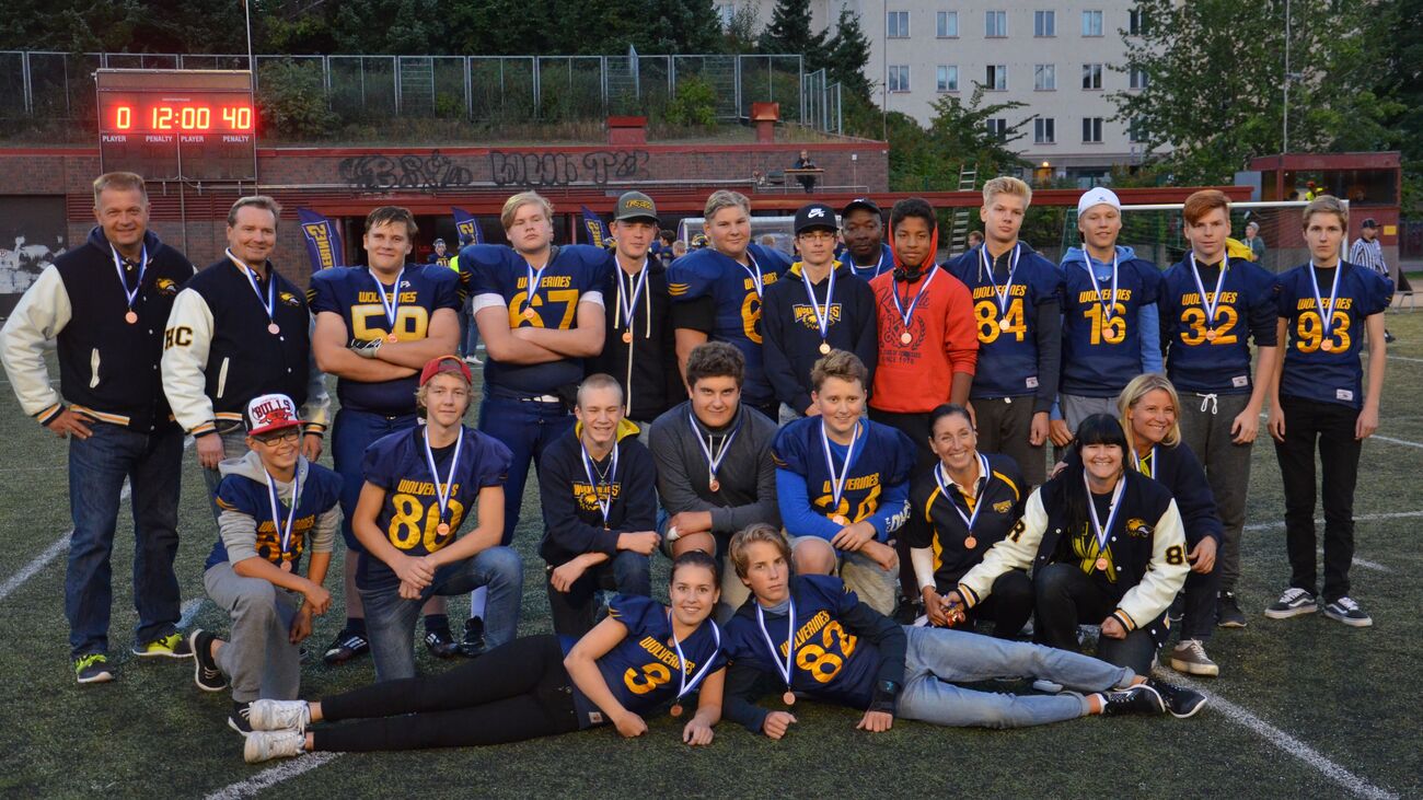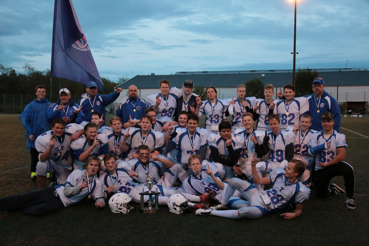 Jukka Kalliokosken erotuomaroimassa siistissä ottelussa ei jaettu yhtään rangaistusta. U15 9vs9 finaalin loppunumerot 34-10 (14-0) Vantaa TAFT:in hyväksi. Vantaa TAFT mestarit 2015 U15 9vs9: | 1 QB JESPER KORKKALAINEN | | 6 DB NICO KOKKONEN | | 7 RB JULIUS PELLINEN | | 8 QB ARTTU PARTANEN | | 13 RB DEREK BROMAN | | 22 DB LEO AUVINEN | | 24 RB SANTERI LINDFORS | | 27 DB ANTTI KEKKONEN | | 28 RB VILJO LEMPINEN | | 36 WR EEMELI TUOVINEN | | 45 DB LAURI LEMPINEN | | 49 WR PEETU LAHTINEN | | 53 OL SANTERI SAASTAMOINEN | | 54 LB VALTTERI FORSMAN | | 59 OL JASPER LINDQVIST | | 60 OL AARO KANKAANPAA | | 68 OL SANTERI PEHKONEN | | 71 DL ROLAND TERAKAJ | | 74 OL JERE VIERIKKO | | 75 OL EMIL MAKINEN | | 78 DL RABBI BHUIYAN | | 81 LB PATRIK PALVAS | | 82 DL MARKUS RAPSA | | 83 RB JESSE NOUSIAINEN | | 84 CB VALTTERI PIIK | | 92 LB JYRI KOHIJOKI | | 99 OL VILLE SIVONEN | | | | Päävalmentaja Vesa Lindfors | | Puolustuskoordinaattori Vesa Waskinen | | Hyökkäyskoordinaattori Mark Collier | | Apuvalmentaja Mika Saastamoinen | | Huoltaja Pasi Nousiainen | | Joukkueenjohtaja Olli Palvas |
