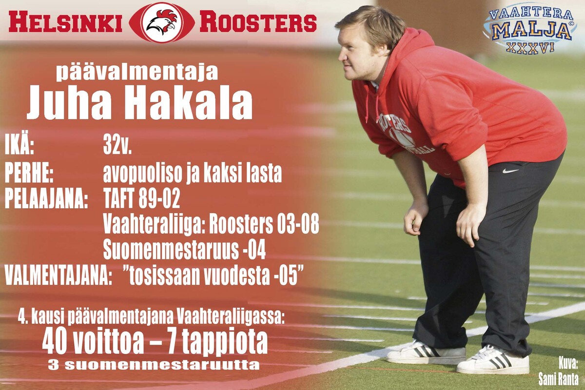 Roostersin päävalmentaja ei ole hävinnyt Vaahteramaljassa kertaakaan. Kun Juha Hakala hyppäsi Roostersin peräsimeen syksyllä 2011, oli Roosters edellisellä kaudellaan hävinnyt yhdeksän ottelua ja voittanut vain yhden. Neljän seuraavan vuoden aikana Roosters on voittanut 40 kertaa ja hävinnyt vain 7 kertaa. Lauantaina Hakala johtaa joukkonsa kolminkertaisena mestarivalmentajana jälleen Vaahteramaljaan. Alkukausi 2015 oli Helsingin punaiselle joukkueelle kuitenkin kaikkea muuta kuin helppo. – Viime kauden jäljiltä vaihtui paljon pelaajia, ja meillä meni tavallista pidempään ennen kuin saimme poppoon kasaan. Pelillistä ilmettä ja ykkösnyrkkiä on viilattu elokuulle asti, kun se aikaisemmin on toiminut toukokuulta lähtien. Viilaus on myös näkynyt tehoina. Roosters on voittanut viimeiset viisi otteluaan piste-erolla 184–65. Sunnuntaina välierässä kaatui viimekauden finaalivastustaja Trojans 33–10. Pelinrakentaja Micah Brown on voittanut kesän aikana jo Puolan mestaruuden ja pelaa lauantaina toisessa finaalissaan reilun kahden kuukauden sisällä. – Mic on pedantti ja hyvä opettaja. Hän on yhdessä Jensin (Holmström) ja Mikon (Koikkalainen) rakentanut hyökkäykseen paketin, joka toimii. Pelkästään Brownin ansioksi Hakala ei laske sitä, että Roosters eteni kauden aikana liigassa eniten niin juosten (168 jaardia/ottelu) kuin heittäen (228 jaardia/ottelu). – Meillä on pelaajia, jotka pystyvät haastamaan vastustajia match-upeissa ympäri kenttää. Pelimme ei ole vain sitä, että juostaan A-aukosta 60 jaardia Jaycen Spearsin kanssa. – Moniteräinen linkkari, jossa on hyviä aseita ympäri kenttää, Hakala tiivistää. Lane Stuhtin johtaman seinäjokisten puolustuksen linjan haasteena on saada kuriin koko liigan ykköskeskushyökkääjä Spears, joka ei joukkueiden edellisessä kohtaamisessa pelannut. Brownin suosikkikohteet Kimi Linnainmaa ja Bernard Luster puolestaan saavat vastaansa takakentän, joka päästi runkosarjassa vähiten heittojaardeja. Siinä, missä Crocodilesilla on liigan pitävin heittopuolustus, on Roostersilla sarjan kestävin juoksupuolustus, joka päästää vastustajaa maata pitkin vain noin 62 jaardia ottelua kohden. – Pelaamme yksikkönä hyvin yhteen. Puolustuksen linjasta (mm. Aleksi Aitala ja Victor Sarvi) löytyy tarpeeksi isoja ja atleettisia pelaajia, jotka pystyy juoksemaan pelejä kiinni. Keskikerroksessa (mm. Dustin Illetschko ja Santtu Äyräväinen) meillä on varmoja taklaajia. Takakentällä meillä on riittävästi nopeutta matchata vastustajien laitahyökkääjien kanssa (mm. Benjamin Bubik ja Stephen Peyton). Justin Sottilaren orkestroimalta Crocodiles-hyökkäykseltä Hakala odottaa samaa kuin Roostersinkin hyökkäysosastolta – monipuolisuutta. – Sottilare on ottanut sen, mitä vastustaja on heille antanut. Maajoukkueen tacklet, eli (Riku) Ala-Koskela ja (Sami) Rantanen, tarjoavat Damonshay Pittin juoksuun blokkivoimaa ja ovat myös heittosuojauksessa vetäneet hyvin. Timothy Thomas ja Harry Innis nousevat Hakalan arveluissa tärkeiksi puolustettaviksi. – Erityisesti Thomasia vastaan täytyy onnistua 1 vs. 1 –match-upeissa eikä isokokoista Innisiä vastaan voi laittaa 150-senttistä kulmapuolustajaa polven korkeudelle huutamaan. – Muutamme puolustuksemme miehityksiä sen mukaan, mitä vastustaja meille näyttää. Yksi sana toistuu Hakalan puheissa usein: match-up. Ottelussa pelataan noin 120 downia ja satoja kaksitaisteluita. Jos Roosters voittaa niitä enemmän kuin Crocodiles, on Hakala lauantaina iltakymmeneltä nelinkertainen suomenmestarivalmentaja.