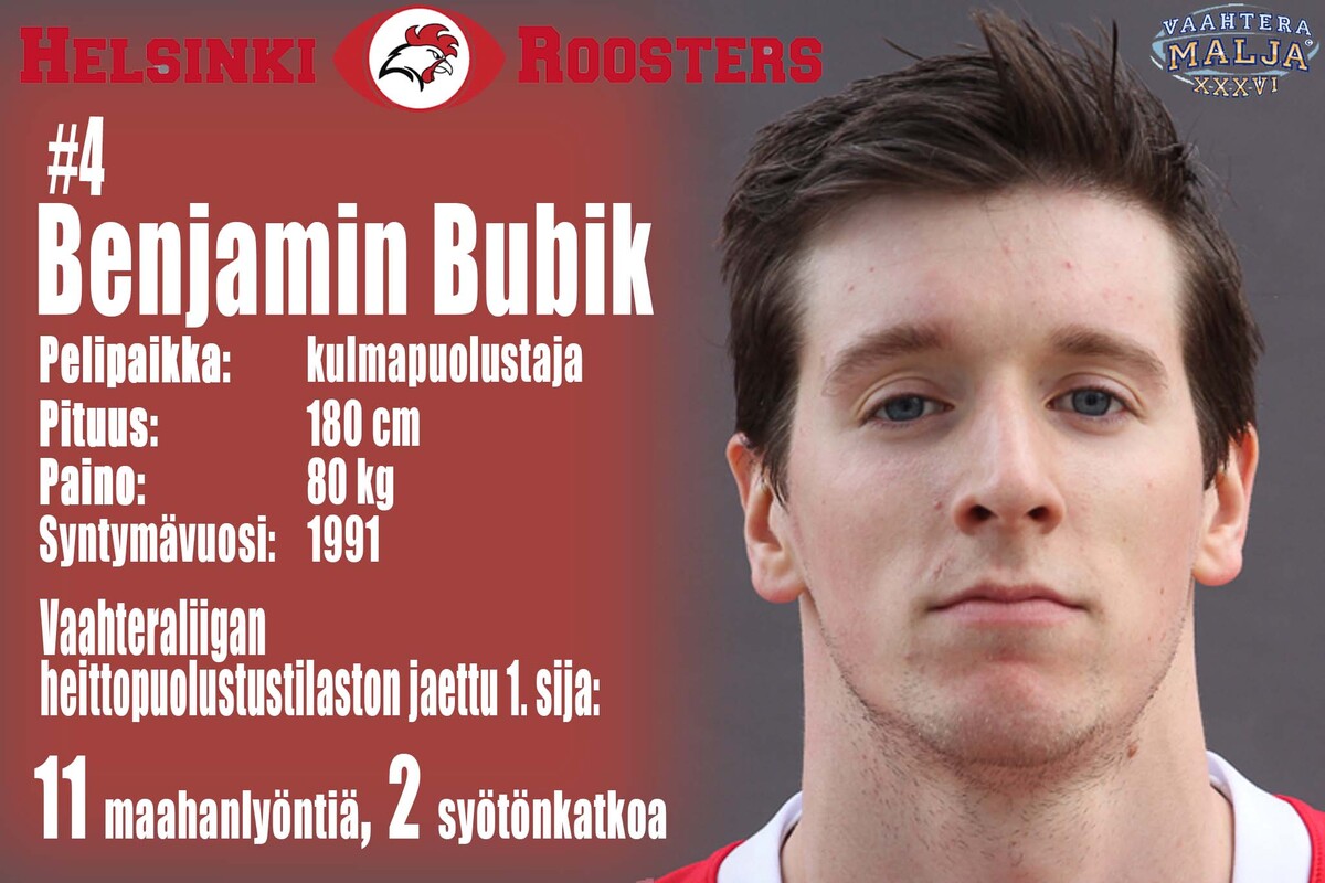 Roosters, puolustus: peli-paikka | # | | syntymä-vuosi | cm | kg | L DE | 55 | Lasse Kankaanpää | 1985 | 192 | 110 | DT | 99 | Roope Lindfors | 1995 | 180 | 95 | DT | 96 | Victor Sarvi | 1992 | 198 | 120 | R DE | 70 | Aleksi Aitala | 1989 | 192 | 130 | SLB | 43 | Santtu Äyräväinen | 1984 | 191 | 108 | MLB | 48 | Dustin Illetschko | 1991 | 180 | 100 | WLB | 8 | Niko Kuikka | 1992 | 187 | 93 | L CB | 33 | Ville Roitto | 1992 | 183 | 80 | SS | 30 | Stephen Peyton | 1989 | 188 | 101 | FS | 29 | Ville Rontu | 1988 | 183 | 83 | R CB | 4 | Benjamin Bubik | 1991 | 180 | 80 |