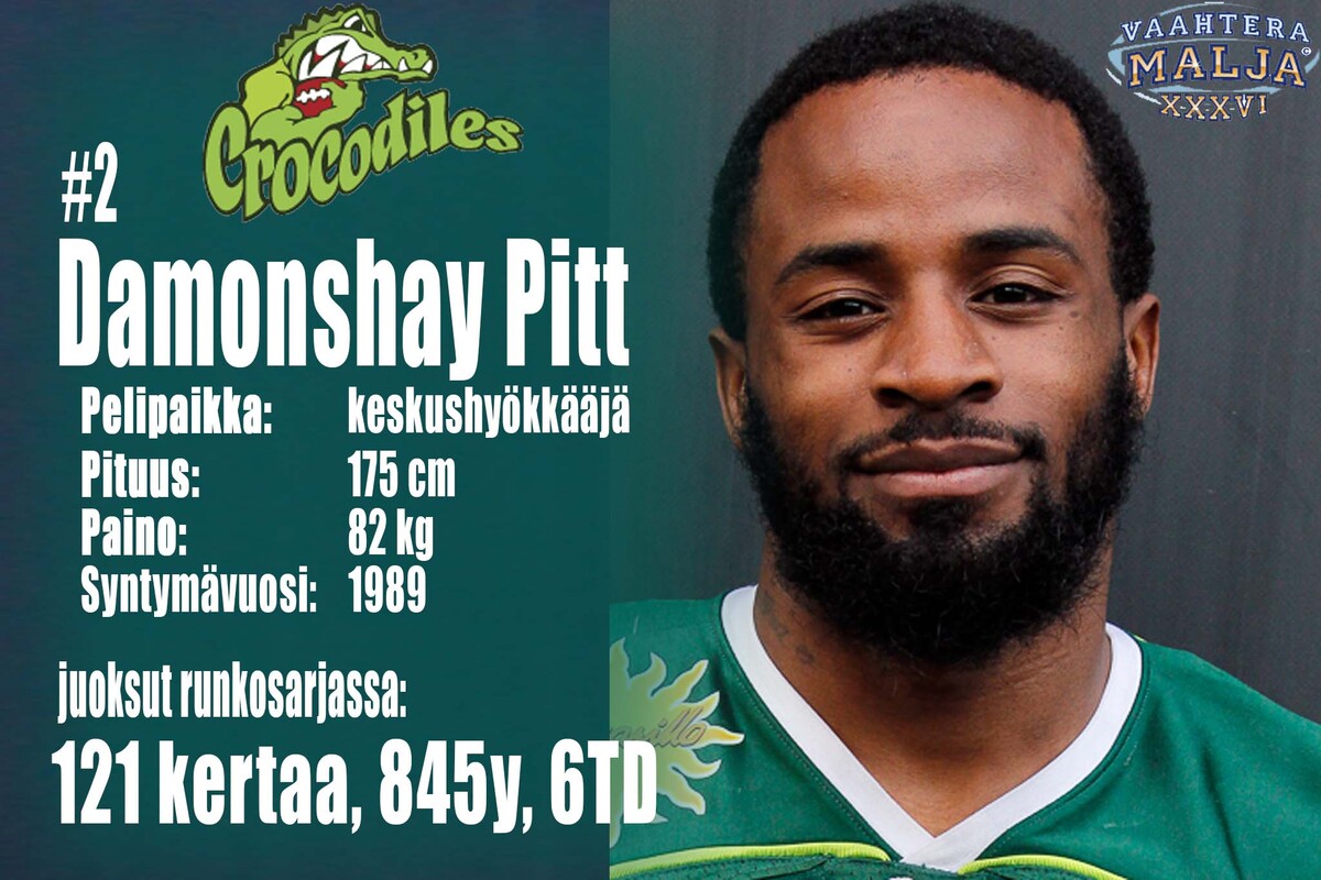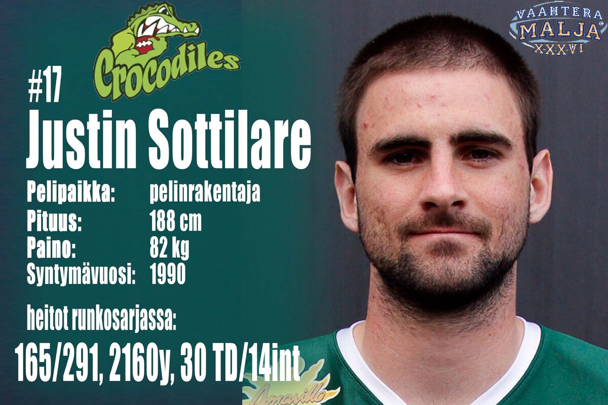 Vaahteramalja-joukkueiden ilmoittamat aloituskokoonpanot: Crocodiles, hyökkäys: pelipaikka | # | | syntymä-vuosi | cm | kg | QB | 17 | Justin Sottilare | 1990 | 188 | 82 | RB | 2 | Damonshay Pitt | 1989 | 175 | 82 | WR | 88 | Spencer Cutlan | 1991 | 181 | 85 | WR | 85 | Timothy Thomas | 1992 | 189 | 85 | WR | 11 | Vili Rajamäki | 1991 | 177 | 82 | WR | 35 | Harry Innis | 1988 | 201 | 121 | LT | 75 | Sami Rantanen | 1986 | 196 | 130 | LG | 74 | Ashley Dewing | 1989 | 192 | 120 | C | 66 | Mikael Paloniemi | 1991 | 185 | 118 | RG | 78 | Harri-Pekka Aho | 1970 | 178 | 118 | RT | 79 | Riku Alakoskela | 1991 | 196 | 122 |
