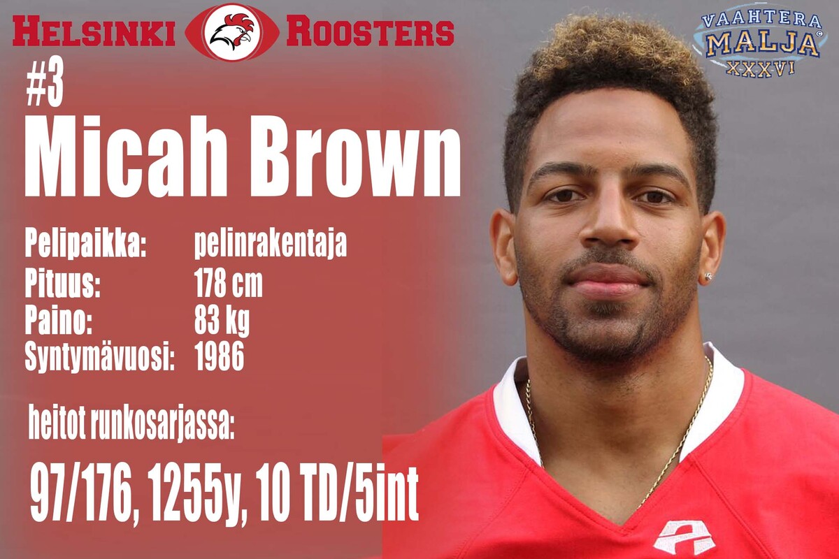 Roosters, hyökkäys: pelipaikka | # | | syntymä-vuosi | cm | kg | QB | 3 | Micah Brown | 1986 | 178 | 83 | RB | 11 | Jaycen Spears | 1987 | 178 | 84 | WR | 7 | Antti Miettinen | 1987 | 180 | 87 | WR | 9 | Bernard Luster | 1988 | 183 | 86 | WR | 32 | Kimi Linnainmaa | 1994 | 178 | 82 | WR | 83 | Markus Lievonen | 1991 | 183 | 80 | LT | 66 | Iiro Luoto | 1984 | 197 | 120 | LG | 54 | Mikko Toiminen | 1995 | 183 | 130 | C | 59 | Benjamin Watkins | 1990 | 185 | 120 | RG | 65 | Jere Lahti | 1996 | 186 | 123 | RT | 53 | Samuli Vehkomäki | 1996 | 186 | 103 |