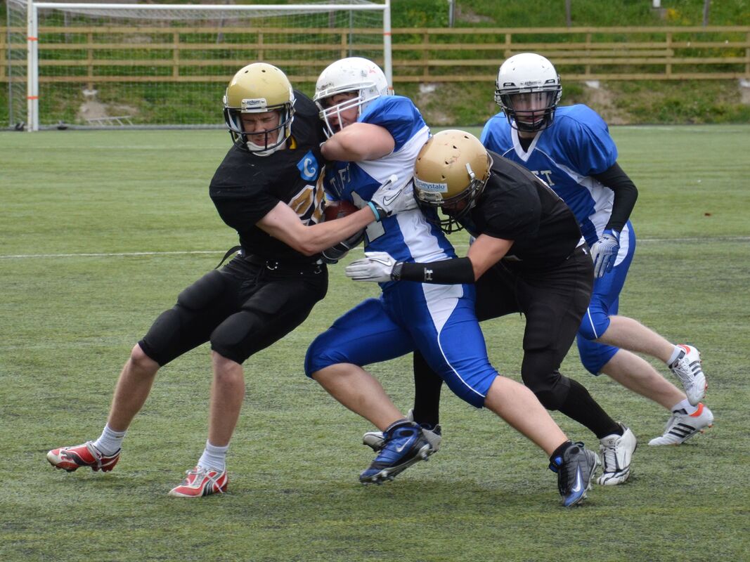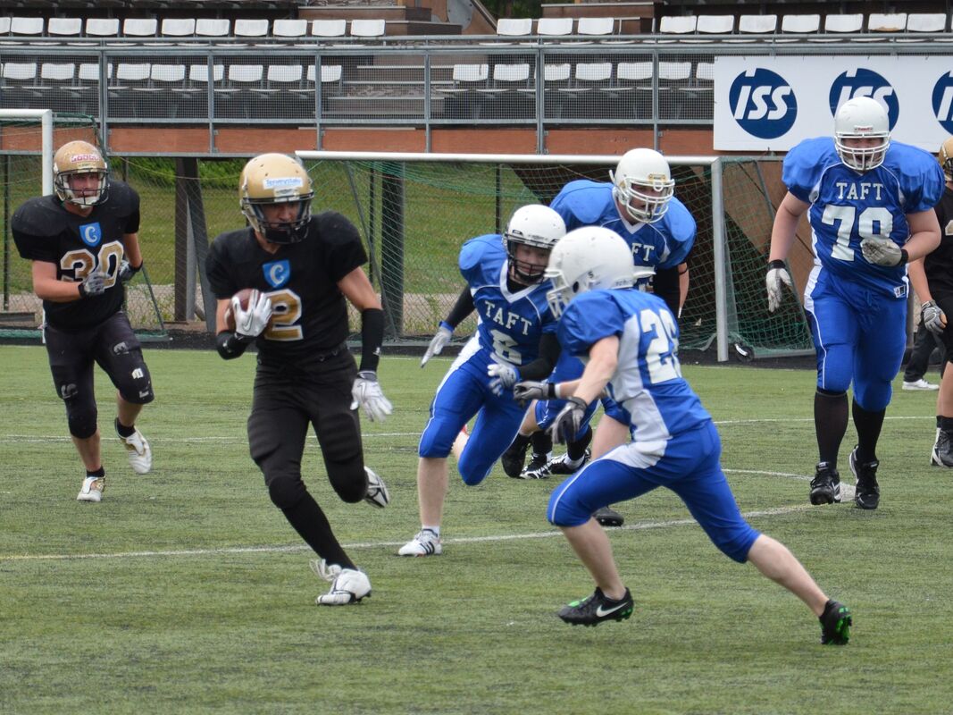 Vantaa TAFT – Porvoo Butchers 0-62 (0-54) Porvoolaisten kokenut ja fyysinen joukkue antoi oppitunnin amerikkalaisessa jalkapallossa Vantaan TAFTin B-nuorille. Andreas Lindo teki maalit ensimmäisellä ja toisella kosketuksellaan palloon. Ensin aloituspotkun palautuksesta ja sen jälkeen palauttamalla lentopotkun. Mikko Seppänen potki lisäpisteet varmasti sisään ja parin minuutin jälkeen Butchers johti ottelua 0-14. Lindo teki myös joukkueelleen kolmannen maalin juoksun muodossa. Neljännen maalin puolestaaan juoksi Butchersin pelinrakentajana toiminut Mikki Nuutila. Mikko Seppänen nautti silminnähden uudesta roolistaan laitahyökkääjänä ja teki 0-34 numerot Nuutilan heitosta. TAFTin valmentajilla Matti Schmidtillä ja Joni Niskasella oli kova työ pitää nuori joukkueensa kuosissa, kun teurastajat tykittivät maaleja putkessa. Pelinrakentaja Joel Alanen ei saanut heittoonsa rytmiä, kun alati vyöryvä porvoolainen musta aalto tuli silmille. Butchersin ilotulitus ei jäänyt tähän, kun huonon lentopotkun aloitussyötön jatkotilanteesta Roni Paananen pääsi toteuttamaan unelmansa ja teki maalin. TAFTin sisukkaasti pelanneen pelinrakentaja Joel Alasen päivää synkensi syötönkatko, josta porvoolais kulmapuolustaja palautti pelivälineen aina maaliin asti. Seppäsen potkaistessa lisäpistepotkun onnistuneesti sisään tilanne oli jo 0-47. Butchersin laitahyökkääjä Henri Levo kaunisteli numeroita kirmaisemalla Nuutilan heiton puolesta kenttää aina maaliin asti. Seppänen potkaisi murskaavaksi taukojohdoksi 0-54 numerot ISS Stadionilla. TAFT sai ensimmäiset yritykset vasta toisen neljänneksen lopussa.Keskushyökkääjä Henri Savolainen rynni muutamaan otteeseen suoraviivaisesti. TAFTin joukkueesta löytyy lupaava ja nopeajalkainen potkujenpalauttaja 16-vuotias Joni Lindholm. Toinen puolisko ottelussa oli kosmetiikkaa, kun ratkaisut tapahtuivat varhaisessa vaiheessa. Porvoon coacheilla Niko Roikolla ja Sami Moilasella on loistavan kokenut ryhmä jalkeilla. |