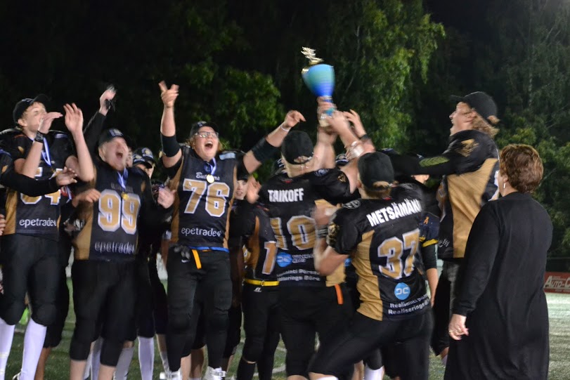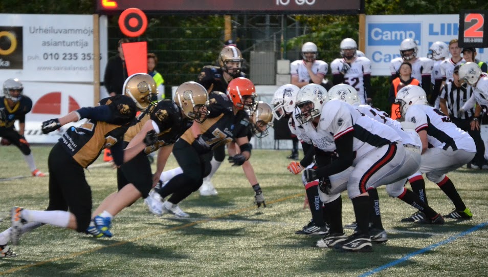 Turussa pelattiin huippujännittävä nuorisofinaali ennätysyleisön edessä. U17 kuninkuus Porvooseen U19 sarjan mestaruuden jatkoksi. Pronssit Helsinki Wolverinesille. Katso huikean finaalin video stream tästä Alkutunnustelun jälkeen molempien joukkueiden puolustukset siirtyivät parrasvaloihin, sillä ottelun kaksi ensimmäistä maalia tehtiin puolustusten tahoilta. Ensin Porvoon Kristian Metsämäki rähmäsi puolessa välissä kenttää, kun kulmapuolustaja Veikka Kuisma täräytti pallon irti. Tukimies Markus Korpela juoksi 60 jaardia maaliin vahvan blokkaussaattueen perässä. Juhani Veijula lisäsi U17 potkusäännön mukaisesti 2 lisäpistettä potkullaan. 8-0. Sitten Butchers tukimies Dan Forsberg vastasi seuraavasta pistesuorituksesta. Forsberg luki peliä tarkasti ja katkaisi Heikki Toivolan ulos suuntautuneen heittokuvion ja palautti pallon maaliin. Daniel Luoma potkaisi lisäpisteet varmasti. 8-8. 1:30 jäljellä ensimmäistä neljännestä. Trojansin Heikki Toivolan heitot eivät osuneet kohdalleen. Runkosarjan aikana heittopeli oli sujunut mallikkaasti, mutta finaalin ensimmäisellä puoliskolla aikaikkunat ja vapaat paikat olivat vähissä. Turku oli yrityspelissään hankalassa asemassa, kun väärät aloitukset ja rikkinäiset pelit pitivät joukkueen usein 3. yritys ja +10 jaardia tilanteissa. Kenttäasemasotaa vaikeutti Daniel Luoman kaksi kaksi touchbackiä aloituspotkuissa sekä hývin onnistuneet lentopotkut, joista yksi oli 70 jaardia pitkä. Porvoo Butchers pelasi pitch-pelin, jossa sentteri Okke Kuipers teki mallikkaan pull outin ja johti blokkausryhmää menestyksesellä. Kristian Metsämäki kiitti ja juoksi vapaana oikeasta laidasta 35 jaardia maaliin. 8-16 Luoman lisäpisteiden onnistuessa. Trojans muutti ilmettään hyökkäyksessään. Leo Lundberg ja Markus Korpela kantoivat suoraviivaisesti palloa eteenpäin. Trojansin hyvä vire jysähti kuitenkin syötönkatkoon. Loistavan ottelun pelannut Metsämäki nappasi taitavasti syötökatkon ja toi pallon kolmen jaardin päähän maalilinjasta 26 jaardin palautuksella. Porvoo pyrki heittämään kolme kertaa, mutta tällä kertaa ilman tulosta. Yhden ratkaisutaklauksen teki15-vuotias tukimies Olli Rajala. Neljännellä yrityksellä Daniel Luoma potkaisi ohi ja tilanne säilyi 8-16 numeroissa. Seuraavaksi nähtiin illan ensimmäinen erikoisjoukkuemaali. Butchersin onnistui blokkaamaan Trojansin lentopotkun ja pääsi peittämään irtopallon kun pelikellossa oli vajaa kolme minuuttia jäljellä toista neljännestä. Butchers potkaisi lisäpisteet Luoman johdalla ja johti ottelua 8-24. Heikki Toivola otti ohjaksia omiin käsiin ja juoksi vaarallisesti muutaman kerran. Myös Veikka Kuisma Trojansin laitahyökkääjistä antoi varoitusmerkkejä kiinniotoillaan. Turkulaisten tuskaksi muodostuivat syötönkatkot ja kova takaa-ajo katkesi lahtelaislähtöisen Brandon Yli-Savolan ottamaan interceptioniin. Porvoon takapuolustajat olivat hienosti hereillä ensimmäisellä jaksolla. Jatkotilanteesta ei kuitenkaan saatu pisteitä ja tauolle mentiin 8-24 porvoolaisten johdossa. Toisella pelipuoliskolla nähtiin sisuuntunut Trojans-miehistö. No huddle -hyökkäys oli oikea veto Trojansin hyökkäyksessä ja Heikki Toivola heitti hyvällä rytmillä onnistuneesti niin Veikka Kuismalle ja Eemeli Valkamolle. Toivola juoksi itse kolmen jaardin päähän maalista, mutta harmittavasti jälleen kerran tilanteessa todettiin kiinnipito. Veikka Kuisman seuraava pitkä kiinniotto avasi kuitenkin mahdollisuudet pisteiden tekoon. Toivola juoksi uudestaan itse ja vei pallon jalan päähän maalista. Markus Korpela juoksi lähietäisyydeltä 6 pistettä. Juhani Veijula potkaisi varmasti pallon Yläkentän koivikkoon. 16-24. Illan toisen erikoisjoukkuemaalin teki Kristian Metsämäki. Hän järkytti kotiyleisön palauttamalla aloituspotkun aina maaliin asti. Tilanne 3. neljänneksellä 16-32 Daniel Luoman potkun onnistuessa. Toivola-Kuisma akseli toimi ja parivaljakko toi turkulaiset hyvään kenttäasemaan. Porvoolaisten puolustus oli kuitenkin kovana ja piti linjansa neljän yrityksen ajan. Toivola yritti kaikkensa ja juoksi jalkansa puuduksiin pelaamalla lähes kaikki yritykset ottelussa kolmannen jakson puoleen väliin asti. Porvoon hyökkäys eteni onnistuneilla pelikutsuilla. Vaivattoman näköisesti juossut Kristian Metsämäki toi palloa eteenpäin. Hiski Niskanen puolestaan onnistui laitahyökkääjän screen-pelillä tuomaan pallon puoleen kenttään. Daniel Luoma pääsi lopulta lisäämään 3 pistettä kenttäpotkumaalilla 16-35 tilanteeksi. Toisen polven futari laitahyökkääjä Jasper Tenko otti kolme hyvää koppia saman driven aikana ja toi turkulaiset maalintekoalueelle. Hyökkäyslinja piti heittoajan maximissaan ja näin Veikka Kuisma karkasi puolustajien selän taakse ja viimeisteli 25 jaardin pituisen maalin. Veijula potkun myötä tilanne kaventui numeroihin 24-35. Turkulaiset puolustivat asemiaan 3 ja ulos -teemalla kotiyleisön kannustaessa hurjasti. Daniel Luoman lentopotku jäi lyhyeksi. Trojans pääsi hyökkäämään rangaistuksen jälkeen 35 jaardin päästä maalista. Veeti Tavi taklasi keskelle suuntautuneet Eemeli Valkamon juoksut, mutta Jasper Tenko oli pelipäällä ja teki lopulta maalin Toivolan tarkasta syötöstä. Veijula potkaisi pallon sisään 32-35. Peliaikaa oli jäljellä 5 minuuttia tunnelma iltaottelussa oli katossa. Porvoon hyökkäys oli jumissa toisella pelipuoliskolla. Hurja saippuapallo-yritys, jonka johdosta Butchers ottamaan rajusti pakkia. Vasen tackle Sakke Siltakorpi onnistui peittämään pallon. Nuorten miesten pelihurmio oli käsinkosketeltava. Dan Forsberg pelasi varman pelin vaikeaa isokoista Juhani Veijulaa vastaan. Robert Johnsonin money-play Tenkolle epäonnistui riskitilanteessa neljännellä yrityksellä. Porvoo sai pallon 15 jaardin päästä turkulaismaalista. Väärä aloitus vei joukkuetta taaksepäin. Mutta kentän kovapäisin kaveri Kristian Metsämäki jakso
