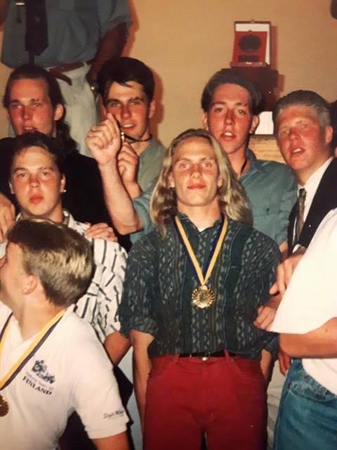 ![]() Niclas Carpelan (kesk.) jatkaa uraansa III-divisioonassa ja Kotka Eaglesissa. Jussi Kähönen (oik.) on kopannut pian 100 touchdownia Carpelanin heitoista. Myös Sin Thu on pelannut jo vuosia Carpelanin ja Kähösen kanssa. Kuva: FSC Media ![]() Kauden 2015 piti olla Carpelanille ja Jussi Kähöselle viimeinen. Spagettimaljaan kaksikko oli yhdessä muutaman muun veteraanipelaajan kanssa varustautunut eläköitymisen symbolein. Kuva: Sami Ranta |