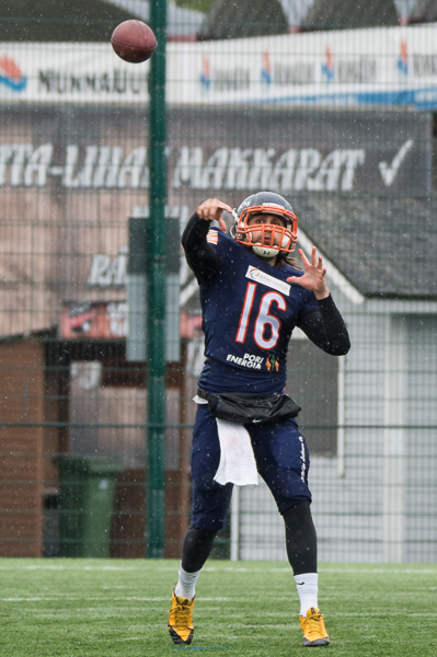 Hanko Sun City taipui Mikkelissä Bouncersille vaivaisella pisteellä II-divisioona käynnistyi lauantaina varsinaisella trillerillä, kun Mikkelissä olivat vastakkain viime kauden pudotuspelijoukkueet Bouncers ja Hanko Sun City. Bouncers nousi kahden touchdownin takaa-ajoasemasta lopulta yhden pisteen voittoon lukemin 15–14. Sun Cityn pelinrakentajana debytoinut Eino Matikainen johti punapaitaisten heittohyökkäystä tehokkaasti ja löysi ensimmäisellä puoliajalla touchdown-heitoillaan ensin sisemmän laitahyökkääjän Lauri Olsbon ja hetkeä myöhemmin Samuli Alppirannan. Joakim Backman potkaisi molempien maalien perään lisäpisteen haarukkaan ja vierasjoukkue oli siirtynyt 14–0 –johtoon. Bouncersin hyökkäys puolestaan ei löytänyt rytmiään ja Sun Cityn puolustus riisti syötönkatkoilla pallon kolmesti itselleen. Ennen puoliaikaa Bouncersin juoksupelin moottori Ilkka Jämsä kuitenkin kavensi tilannetta touchdownilla. Olli Karhun onnistuneen lisäpistepotkun myötä puoliaikaa vietettiin lukemissa 7–14. Ottelun toinen puoliaika oli puolustusten hallintaa, pistesuorituksia saatiin odottaa aina viimeisille sekunneille asti. Bouncers-hyökkäys kehitti melkoisen ihmeen ja eteni reilut puoli minuuttia ennen ottelun loppua ensin neljännen yrityksen onnistumisella uusiin yrityksiin yli 20 jaardin päästä. Näkyvästi Bouncersin heittopelissä esiintynyt Johannes Jauhiainen koppasi post-kuvion kiinni ja kuljetti pallon kahden jaardin päähän maalialueesta. Kuusi sekuntia ennen päätösvihellystä Jämsä löysi toistamiseen tiensä maalialueelle ja tilanne oli 13–14. Mikkeliläisten päävalmentaja Esa Suhonen otti riskin ja päätti pelata lisäpisteyrityksen. Jämsä sai pallon ja juoksi sen uudelleen maalialueelle. Bouncers nousi pisteellä ohi, ja lukemat 15–14 säilyivät loppuun asti. – Meille tuli aivan liikaa kolme ja ulos -tilanteita emmekä saaneet tarpeeksi onnistumisia hyökkäyspäässä, Sun Cityn päävalmentaja Tony Anderson kommentoi Sun Cityn otteluraportissa. – Puolustus sen sijaan pelasi hyvin ja piti meidät mukana ottelussa. Meidän pisteetkin tulivat puolustuksen tarjotessa hyökkäykselle hyvät lähtöasetelmat. Samoilla linjoilla asia nähtiin myös mikkeliläisten leirissä. – Jämsä nousi ottelun ottelun hahmoksi, kommentoi Bouncersin Petri Toivanen. – Kummankin joukkueen hyökkäys oli vielä hakemista ja varsinkin heittopeli oli aika takkuista.