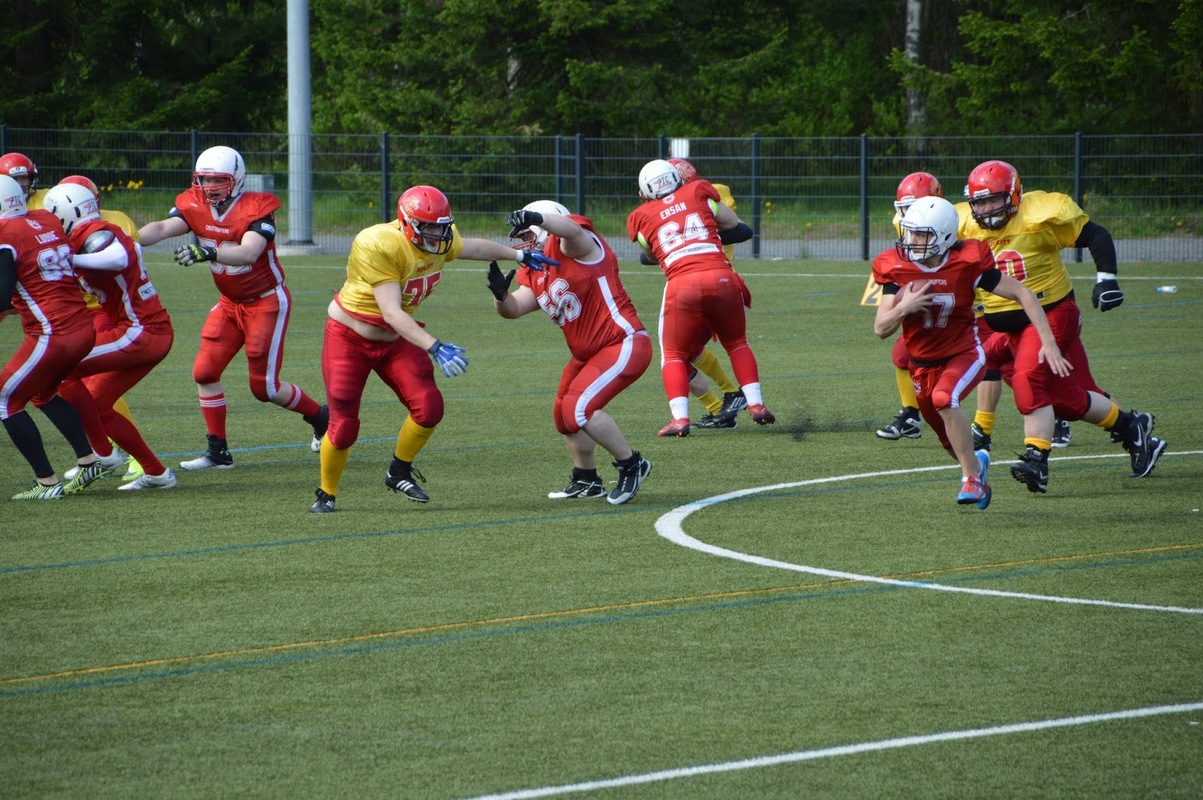 Ghosthunters – Sun City 27 –14 (6–0) Lauantain ensimmäisessä ottelussa puolustukset olivat niskan päällä läpi koko ensimmäisen puoliajan. Puoliajan ainoasta maalisuorituksesta vastasi kotijoukkue, kun avauspelin jälkeen hyökkäyksensä kahden sisemmän laitahyökkääjän jumbo-muodostelmaksi muuttaneen Ghosthuntersin pelinrakentaja Thomas Salenius löysi heitollaan kaksimetrisen Henri Toimisen. – Muutimme systeemiämme, koska meiltä puuttui muun muassa ykköslaitahyökkääjä Joni Riihelä ja vastaavasti hyökkäyksen linjamme on yksi vahvimmista osa-alueistamme, Ghosthuntersin päävalmentaja Sami Telenius kommentoi. – Salenius on pelinrakentajana mies paikallaan, Telenius kehaisee nuorta pelinrakentajaa. – Oman suorittamisensa lisäksi hän pystyy muuttamaan pelejä linjasta ja johtamaan hyökkäystä. Sun Cityn hyökkäys sakkasi kriittisissä paikoissa ja myös pallon menetykset kiusasivat hankolaisten hyökkäysmoottorin lämpenemistä. Hyvistä kenttäasemista huolimatta Sun Cityn hyökkäysvuorot jäivät toistuvasti tyhjiksi. Ghosthuntersin Ronny Lehmussaari keräsi ottelussa 10 taklausta ja oli jatkuvasti myös Sun Cityn pelinrakentajan Eino Matikaisen heittojen tiellä. Vierasjoukkueen ahdinko kasvoi toisella puoliajalla, kun Ghosthuntersin hyökkäys onnistui maalinteossa kahdesti, ja kolmas neljännes kallistui nokialaisille puhtaasti 15–0. Noin 100 jaardia iltapäivän aikana vahvan linjan raivaamana juossut Tero Seppälä ja hyökkäyksen linjasta keskushyökkääjäksi keikkoja tekevä Ali Ersan johtivat pistetehtailua. Sun City kärsi avauskierroksella viimesekuntien tappion Mikkeli Bouncersille, ja hankolaiset pääsivät päätösneljänneksellä nyt itse aloittamaan oman kirinsä, kun pelinrakentaja Eino Matikainen juoksi pallon kanssa päätyyn. Joakim Backmanin lisäpisteen onnistuttua tilanne oli 21–7. Aikaa oli vielä jäljellä. Ghosthuntersin kuittausta Menkalan Tekonurmen katsomoon saapunut yleisö ei joutunut pitkään odottamaan. Sun Cityn maalin jälkeinen aloituspotku päätyi Joonas Törmän käsiin ja nopeajalkainen kulmapuolustaja palautti pallon välittömästi 85 jaardia touchdowniksi asti. Hankolaisten hyökkäyspeli oli kuitenkin saatu käyntiin ja seuraavalla hyökkäysvuorolla Matikainen löysi heitollaan Iiro Santalan. Backmanin onnistuneen lisäpisteen jälkeen oltiin loppulukemissa 27–14. – Aikahan siinä sitten lopussa tuli vastaan, Andersson kertoi Sun Cityn otteluraportissa. – Ainoa pieni positiivinen asia tästä tappiosta taisi olla se, että osoitimme ainakin että pienestä takaa-ajoasemasta voimme vielä nousta mukaan. Telenius oli tyytyväinen nokialaisten tason nostoon tappiollisen Pori-pelin jälkeen: – Joukkueemme keski-ikä on noin 20 vuotta, joten ensimmäinen ottelu oli vielä hakemista. Nyt se näytti jo siltä, mihin me parhaimmillamme pystymme.