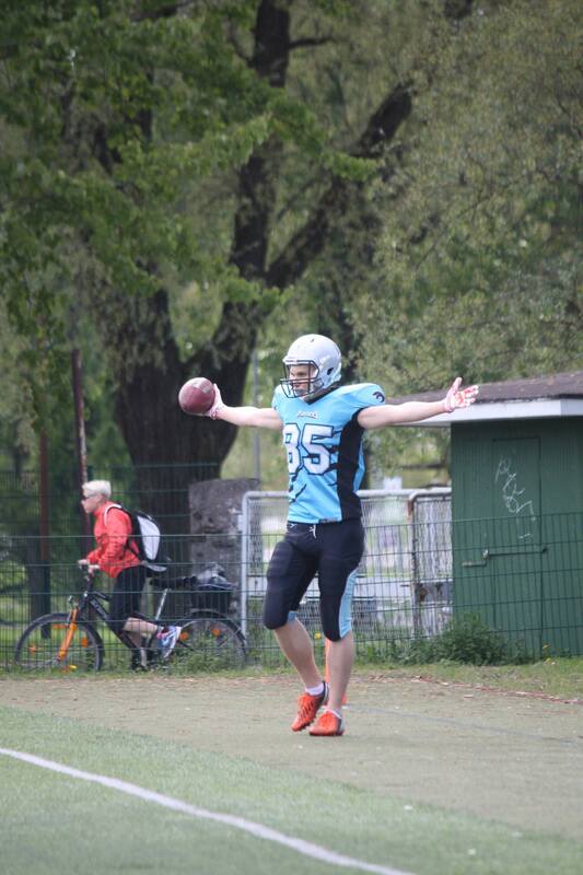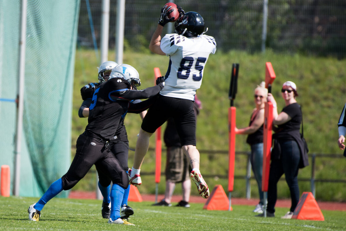 Panthers – Bulldogs 27–6 (20–0) Lahti Panthersille lisättiin viikonlopun aikana yhteensä 4 sarjapistettä. Ensimmäiset kaksi Panthers sai lauantaina, kun Malmi Blaze tuomittiin häviämään viikon takainen ottelunsa lahtelaisia vastaan edustuskelvottomien pelaajien vuoksi. Sunnuntaina Panthers karkasi Bulldogsilta jo ensimäisellä puoliajalla kolmen touchdownin karkumatkalle ja piti johtoasemansa loppuun asti. Panthers-pelinrakentaja Eemi Huhtinen oli yksi ottelun hahmoista. Avausneljänneksellä Huhtinen tavoitti heitollaan laitahyökkääjä Sebastian Juuren, joka löi taululle ottelun avauspisteet. Toisella neljänneksellä Huhtinen vastasi iltapäivän komeimmasta yksilösuorituksesta ja karkasi linjan läpi 71-jaardiseen touchdowniin. Kun Ville Ampuja palautti ennen puoliaikaa syötönkatkon maaliin, olivat taukolukemat 20–0 kotijoukkueen hyväksi. Toisella puoliajalla Huhtinen heitti yhden osuman Matti Liskille, joka Petteri Lauhian raivaaman väylän läpi kuljetti pallon maaliin. Pienellä kokoonpanolla sitkeästi loppuun asti taistellut Bulldogs onnistui vielä kaventamaan loppulukemiksi 27–6, mutta Panthers-puolustus piti ottelun parhaana palkitun Atte Heiskanen (5 säkitystä) johdolla sipoolaisten kirin kurissa. Kuvia ottelusta (Taneli Tontti)