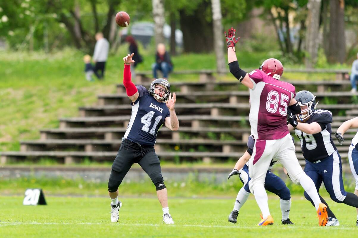Kotka Eagles – Sipoo Bulldogs 49–0 (35–0) Kotkan Puistolassa pelattiin kauden ensimmäinen Eaglesin kotiottelu, jossa heti alkutahdit käänsivät pelin isännille. Kahdessa edellisessä ottelussa molemmissa Eagles oli lyönyt isoja numeroita taululle ja nyt puolustukselle oli luvassa ennakkoon kevyempi työsarka, sillä vierasjoukkue Sipoo Bulldogs oli kahdessa aiemmassa ottelussa tehnyt ainoastaan kaksi touchdownia. Alkuasetelmat myös pitivät. Niclas Carpelanin johdolla Eagles löi jo puoliaikaan mennessä taululle viisi touchdownia lisäpisteineen ja toinen puoliaika oli enemmänkin pelailua ja pelisysteemien kokeilua. Carpelan heitti ottelussa 5 touchdownia. Kolme niistä otti kiinni Carpelanin luottolaitahyökkääjä Jussi Kähönen.