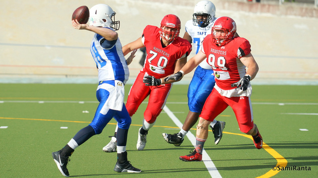 Roosters isännöi perjantain TV-ottelussa Velodromilla Saintsia Kahden viikon tauolta otteluiden pariin palaava Tampere Saints kohtaa perjantaina jälleen yhden viimevuoden mitalijoukkueen – tällä kertaa kultamitalistin, Helsinki Roostersin. Kaksi ensimmäistä Saintsin ottelua ovat päättyneet suurinumeroisiin tappioihin, kun ensin Seinäjoella Crocodiles (62–0) ja viikkoa myöhemmin Tampereella Anders Trojans Turku (13–50) päihitti sarjanousijan. Saintsin päävalmentaja Teemu Majanderin puheesta on läpi kevään kuultanut innostus lähteä haastamaan "isoja joukkueita". Roosters-otteluun Majander tiedostaa tuovansa Saintsin haastajan roolissa. – Kolmen ison kohtaaminen kauden alkuun huipentuu mestaria vastaan Velodromilla TV-kameroiden edessä. Odotan innokasta pyhimysjoukkuetta haastamaan Ison Punaisen. Roosters on aloittanut kautensa kolmella voitolla, mutta avauskierroksen Trojans-voiton (38–7) jälkeen ilman pelinrakentaja Micah Brownia pelannut Roosters kaatoi Porvoo Butchersin ja Vantaa TAFT:n väkinäisen suorittamisen jälkeen. Maanantaina pelatun TAFT-ottelun jälkeen myös valmistautumisaika on nyt poikkeuksellisen lyhyt – vain kolme iltaa. – Meillä on selkeää alisuorittamista edellisissä otteluissa. Harjoituksissa meno on näyttänyt siltä, että palaamme omalle tasollemme, Roostersin päävalmentaja Juha Hakala kertoo ja nostaa esimerkiksi Butchers-ottelun heikon taklaamisen. Yhdestä asiasta Hakala haluaa perjantaina huolehtia tarkasti: kenttäasema. – Jouduimme TAFT:ia vastana olemaan puolustuksen kanssa aika paljon kentällä ja lisäksi puolustamaan paljon lyhyttä kenttää. Nyt täytyy pystyä liikuttamaan palloa varmemmin.