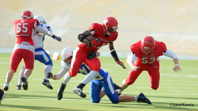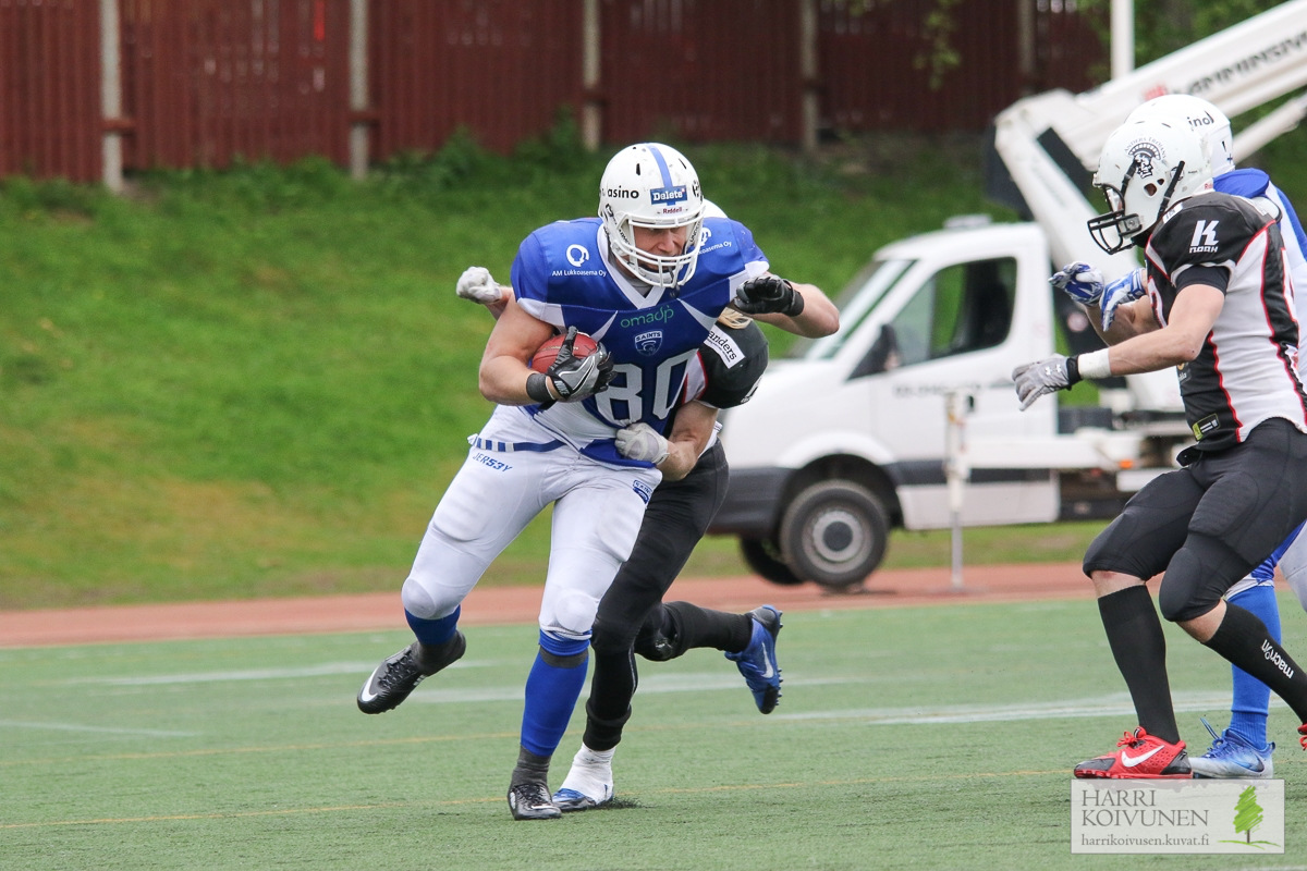 Saintsin hyökkäys on valmiina ottamaan askeleen eteenpäin Majander on saanut pelinrakentaja Dominic Bonan kanssa viimeiset kaksi viikkoa hioa Saints-hyökkäyksen pelikuvioita kuntoon. Trojansia vastaan Saints pystyi ajoittain liikuttamaan palloa monipuolisesti ja varsinkin Tommi Pinnan rooli nousi avausviikosta huomattavasti suuremmaksi. – QB Bona pääsee taas väliviikon jälkeen töihin ja hänen käsissään lepää paljon, Majander toteaa lyhyesti. Hakala nostaa esille erityisesti Saintsin heittopelin. – Pinta on iso kohde, ja pelasi hyvin Turkua vastaan, Hakala kertoo. – Olen itse ehtinyt valmentaa Eero Hiltusta juniori-aikoina ja tiedän, että hän on erittäin nopea laitahyökkääjä, kuten myös Henri Laine toisella puolella. Laine koppasi Trojansia vastaan viisi palloa ja eteni niillä 39 jaardia. Hiltunen puolestaan teki Bonan heitosta 98-jaardisen touchdownin. Pinta on silti Hakalan papereissa haaste numero 1. – Hänelle meidän täytyy löytää sopiva vastapeluri, Hakala kertoo. Olisiko sellainen mahdollisesti Santtu Äyräväinen? – Olet varsinainen visionääri! Hehän ovat pelanneet aiemminkin vastakkain, joten siitä saadaan jälleen hyvä taistelu. Äyräväinen on alkukaudesta ehtinyt keräämään kaksi pelinrakentajasäkitystä ja myös kaksi syötönkatkoa. Kahteen säkitykseen päässyt linjapuolustaja Ilari Nikku sekä kaksi syötönkatkoa napannut takamies Curtis Slater ovat myös perjantaina seuraamisen arvoisia puolustajia. Dominic Bona on kahden ottelun jälkeen Saintsin ahkerin juoksuetenijä. Perjantaina tamperelaiset saavat kokoonpanoon takaisin Dajon Newellin, joka ei pienen loukkaantumisen vuoksi pelannut Trojansia vastaan. Pallonmenetykset kiusasivat Saintsia edellisessä ottelussa ja huolellisuus on yksi avainasioista myös perjantaina. Majander nostaa lisäksi esille ottelun alun merkityksen: – Otteluiden alut ovat olleet meille vaikeita. Siitä me lähdemme että saamme koneet käyntiin ja itseluottamuksen nousuun heti, Saints-päävalmentaja päättää.