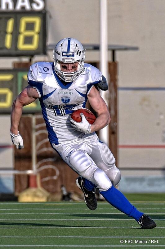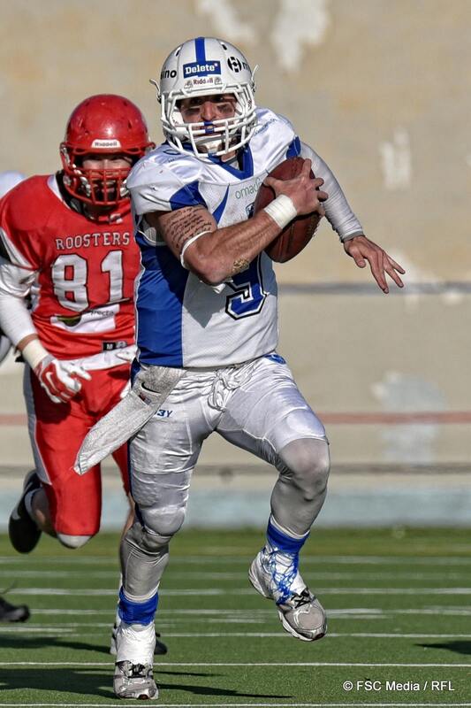 ![]() Pelinrakentaja Micah Brown palasi kentälle johtamaan Roostersin hyökkäystä. Brown juoksi ottelun avaus-touchdownin 50-jaardisella juoksulla, mutta heitoista onnistui perjantaina ainoastaan yksi. Toisella puoliajalla Brown katsoi Otso Flinkmanin pelaamista sivurajalta. Kuva: FSC Media |