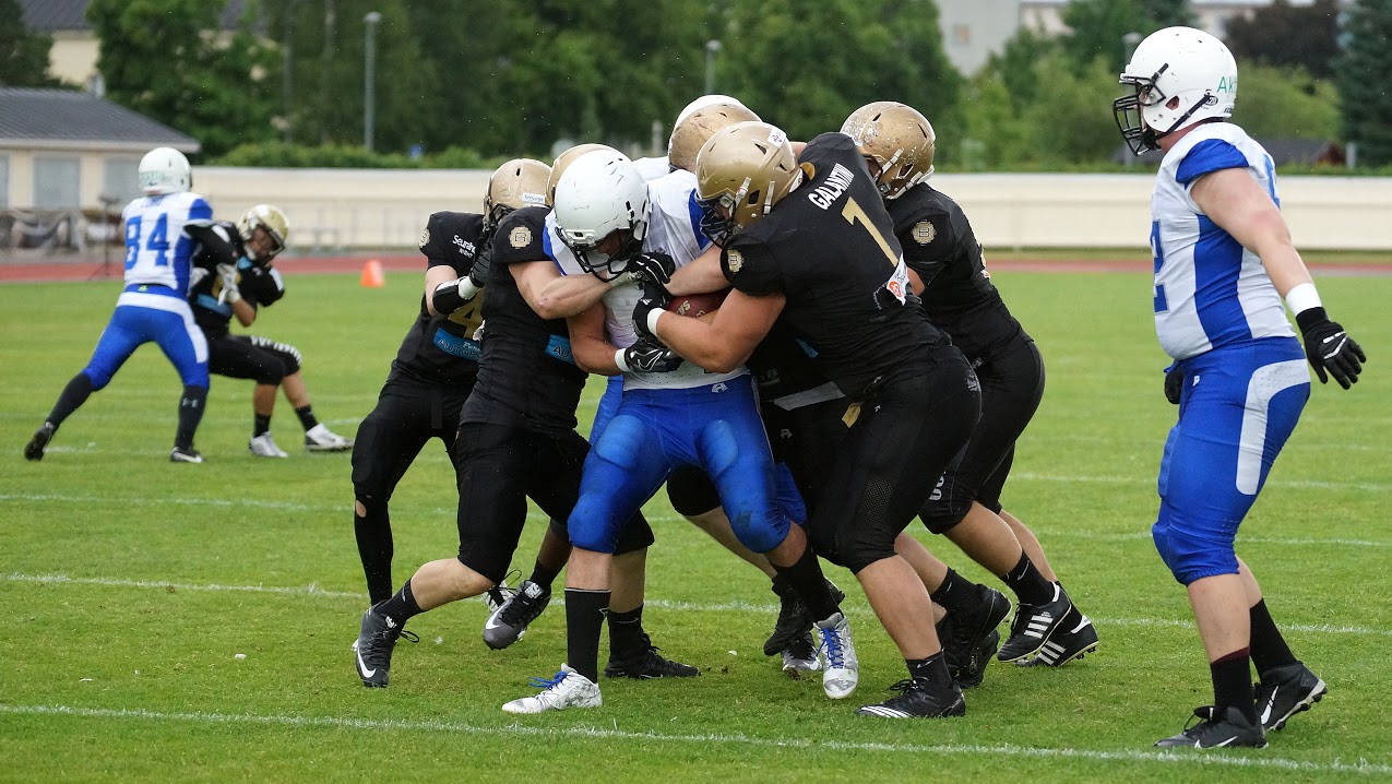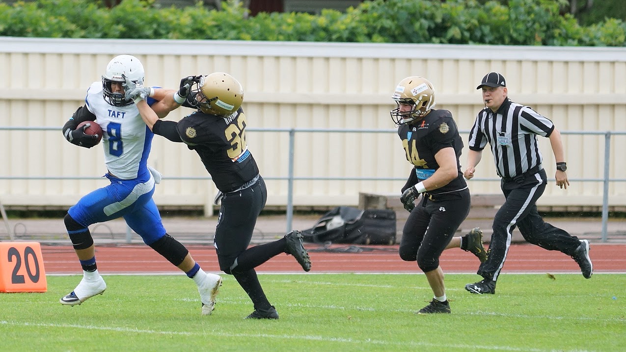 TAFT hallitsi toista jaksoa mutta joutui taipumaan vain 15 sekuntia ennen loppua Vaahteraliigan perjantai-illan TV-ottelusta kehkeytyi varsinainen trilleri. Avauspuoliajan jälkeen lukemin 10–7 johtanut kotijoukkue Porvoo Butchers jäi toisella Vantaan TAFT:n varjoon, mutta laitahyökkääjä Mikko Seppänen touchdown vain 15 sekuntia ennen loppua ratkaisi ottelun lopulta porvoolaisille numeroin 17–14. Ottelussa käyntiin pääsi paremmin vierasjoukkue TAFT. Tasapainoisesti sekä juoksua että heittoa pelannut vantaalaisjoukkue pystyi siirtämään palloa kohti Butchersin päätyä. Andre Dahlmanin ja nuoren Antti Lahtisen juoksut pysähtyivät porvoolaisten Michael Galantinin ja Tero Kontiaisen toimesta useasti jo aloituslinjaan, mutta vastaavasti Joel Sislerin kiinniotoilla TAFT eteni avausneljänneksellä kaksikin yli 30-jaardista pikamatkaa. Jälkimmäisellä niistä Sisler vei pallon suoraan maalin nostaen vantaalaiset 0–7 –johtoon. Butchers onnistui vielä ensimmäisen neljänneksen aikana kaventamaan Daniel Luoman potkumaalilla, ja toisella neljänneksellä Butchers siirtyi ensimmäistä kertaa johtoon, kun keskushyökkääjä Sebastian Lindell punnersi linjan vasemmasta päädystä kauden ensimmäisen touchdowninsa. Illan aikana pallon kanssa 99 jaardia juossut Kemani Jones oli kuitenkin avauspuoliajalla kentän ykköskeskushyökkääjä. TAFT:n pelinrakentaja Cole Webb heitti ensimmäisellä puoliajalla 75 prosentin varmuudella 125 jaardia, mutta vastaavasti vantaalaisten juoksutilasto oli murheellinen: -6 jaardia. Webb menetti ensimmäisellä neljänneksellä ykköslaitahyökkääjänsä Cedric Johnsonin. Jani Luiro, Tyrwone Still ja erityisesti Sisler kuitenkin käyttivät läpi perjantai-illan tilaisuutensa tehokkaasti hyödykseen. Toki toisen puoliajan märässä ilmassa palloja jäi myös ottamatta kiinni. Butchers siirsi avauspuolikkaalla palloa tasaisemmin, mutta pelinrakentaja Trevor Vaseyn heittovarmuus oli perjantainakin alhainen ja lisäksi yksi Vaseyn heitoista päätyi toisella neljänneksellä TAFT-kulmapuolustaja Valtteri Poutun käsiin.