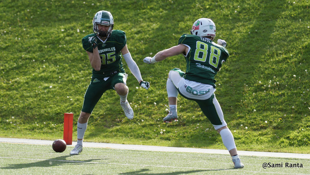 ![]() Crocodilesin lisäksi myös Nokia Ghosthunterisissa pelannut Jarno Pynttäri palaa loppukaudeksi Crocodilesin puolustukseen. ![]() Walesilaisella laitahyökkääjäkaksikolla Timothy Thomasilla ja Spencer Cutlanilla on kuluvalla kaudella ollut syytä iloon. Crocodiles on voittanut kaikki viisi otteluaan. Lauantaina Crocodiles kohtaa kotikentällään liigan kärkikamppailussa toisen tappiottoman joukkueen Helsinki Roostersin. Kuva: Sami Ranta |